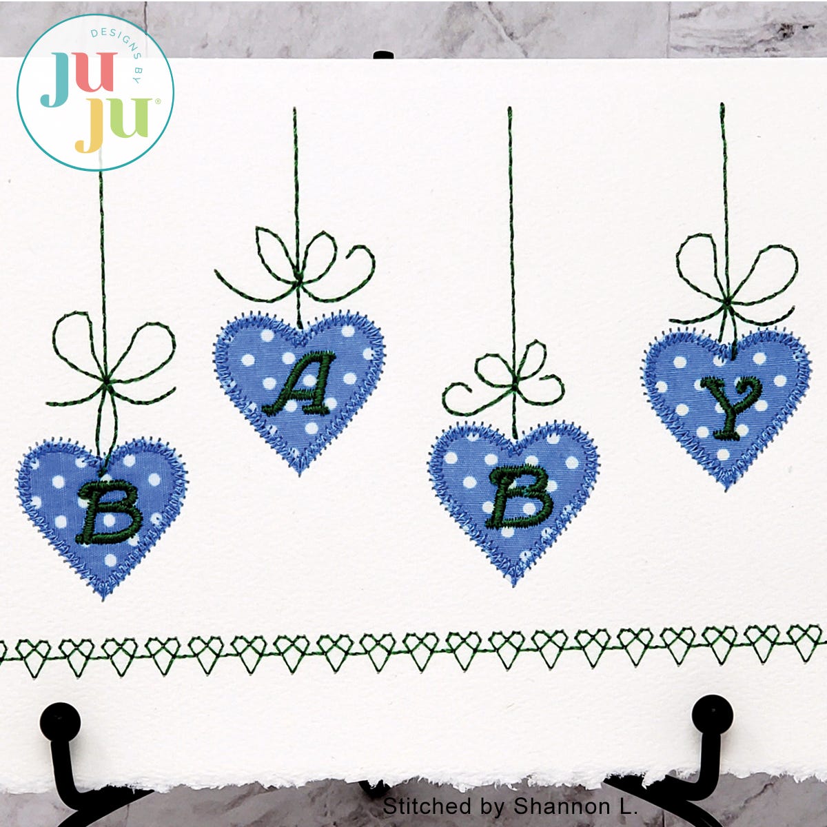 You are receiving a total of 3 stitch files: one version with the word “Love" spelled out on the hearts; another one with “Baby" and a third one with just the applique hearts and no word. The card designs come with placement stitches to ensure accurate placement on the cards. Instructions include tips on stitching on blank cards. Comes with photos showing you how to make a greeting card using the design. The cards can be used for Valentine's Day, birthdays, weddings, and as a congratulatory card on the arrival of a new baby.