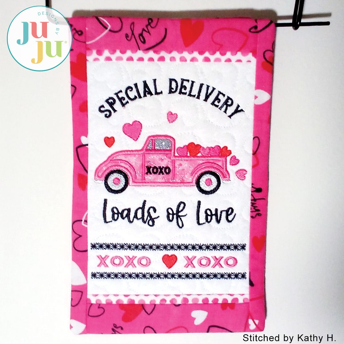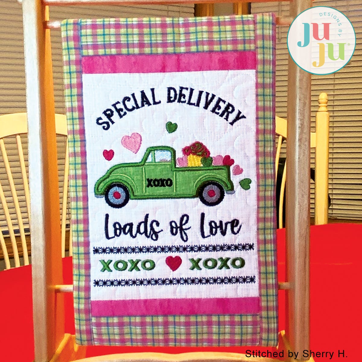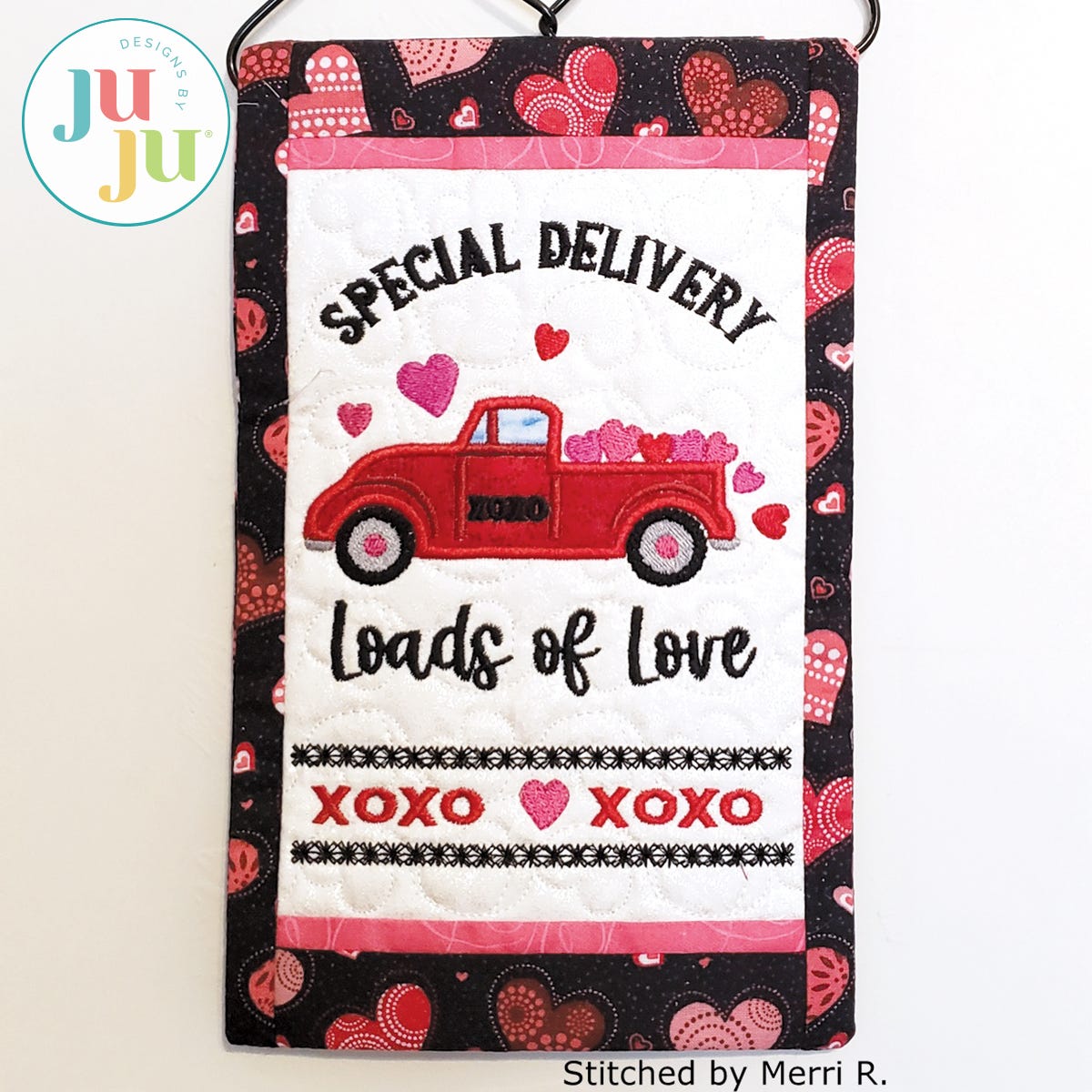 Here is a fun project that will help you decorate for the month of February. The background of the mini quilt is quilted in the hoop with a heart motif. The various borders get attached during the in the hoop process. There is a "sleeve" in the back for easu hanging of the quilt. The sleeve, too, is applied during the embroidery process. No additional hand or sewing machine stitching is required.