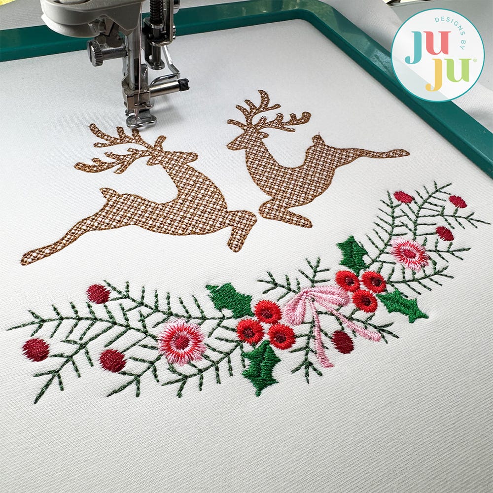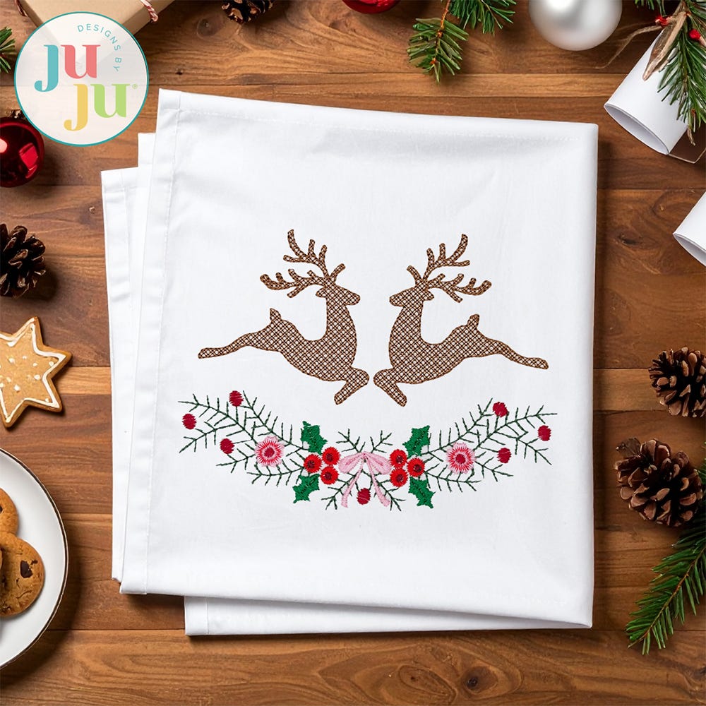 Add a jolly holiday touch to your stitching with this whimsical Heirloom Garden Deer design. This design features a festive florals and a bow, accenting two reindeer designed in a charming mix of embroidery stitch types.