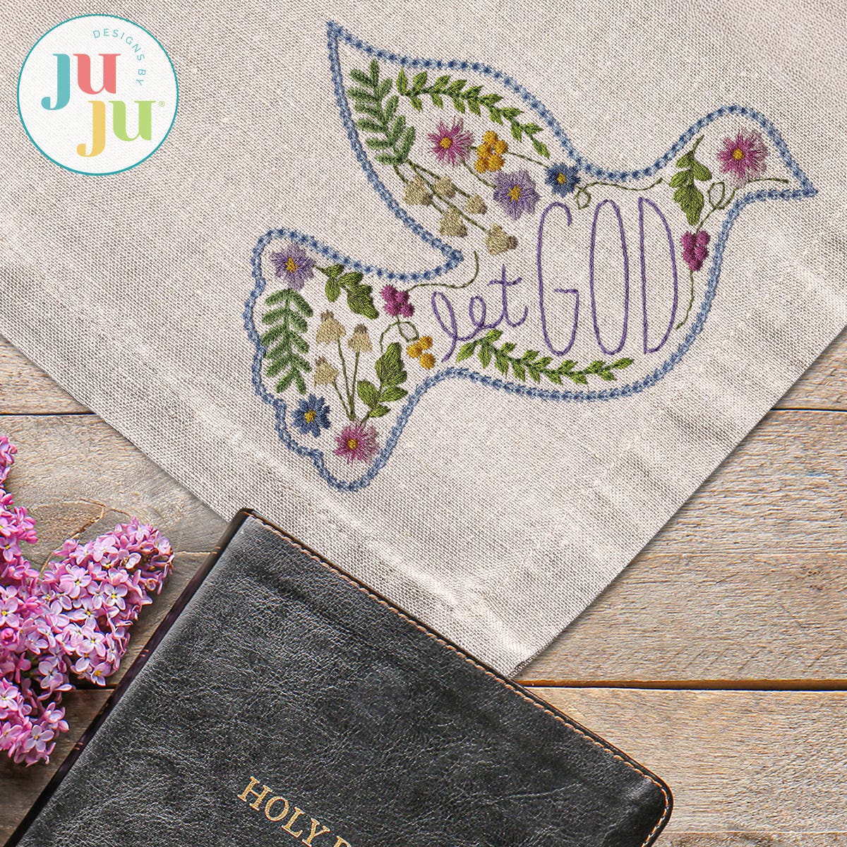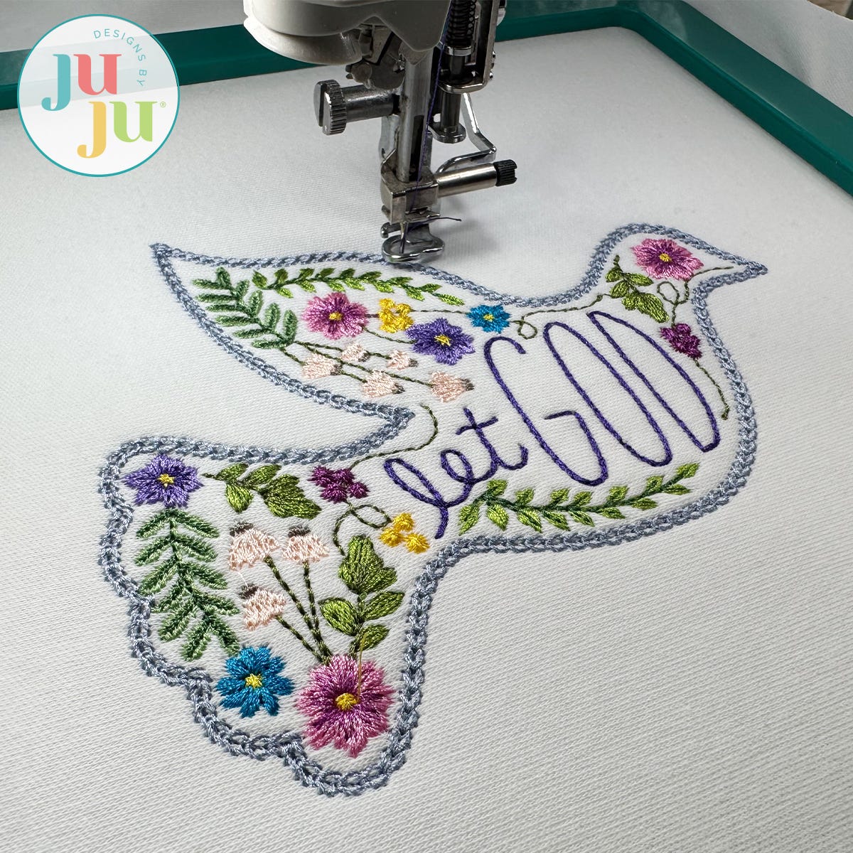 Let God - Our single, embroidery-only design features this comforting phrase, accented with flowers, and a peaceful dove shaped frame. The bean stitch lettering is included in the design file, as pictured.