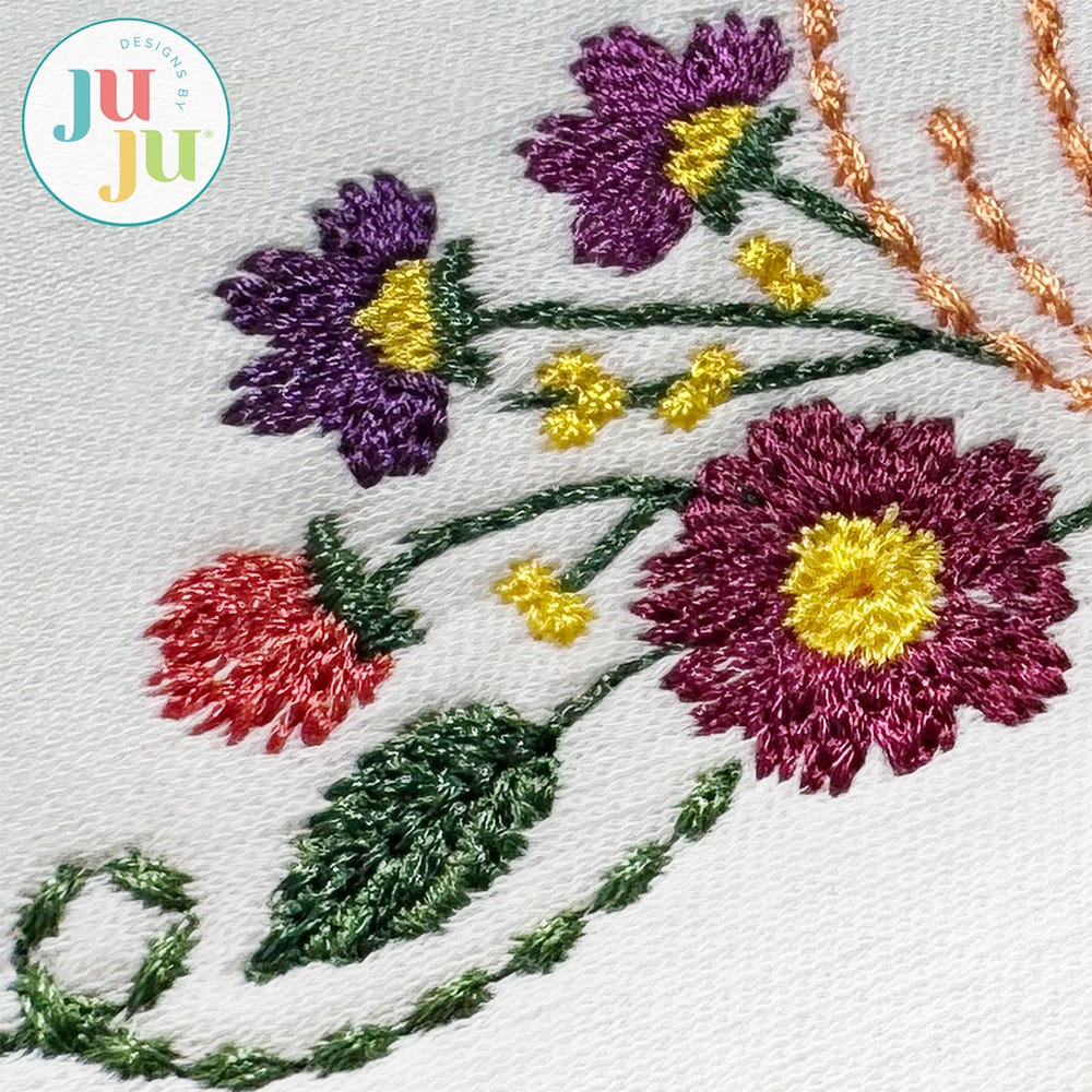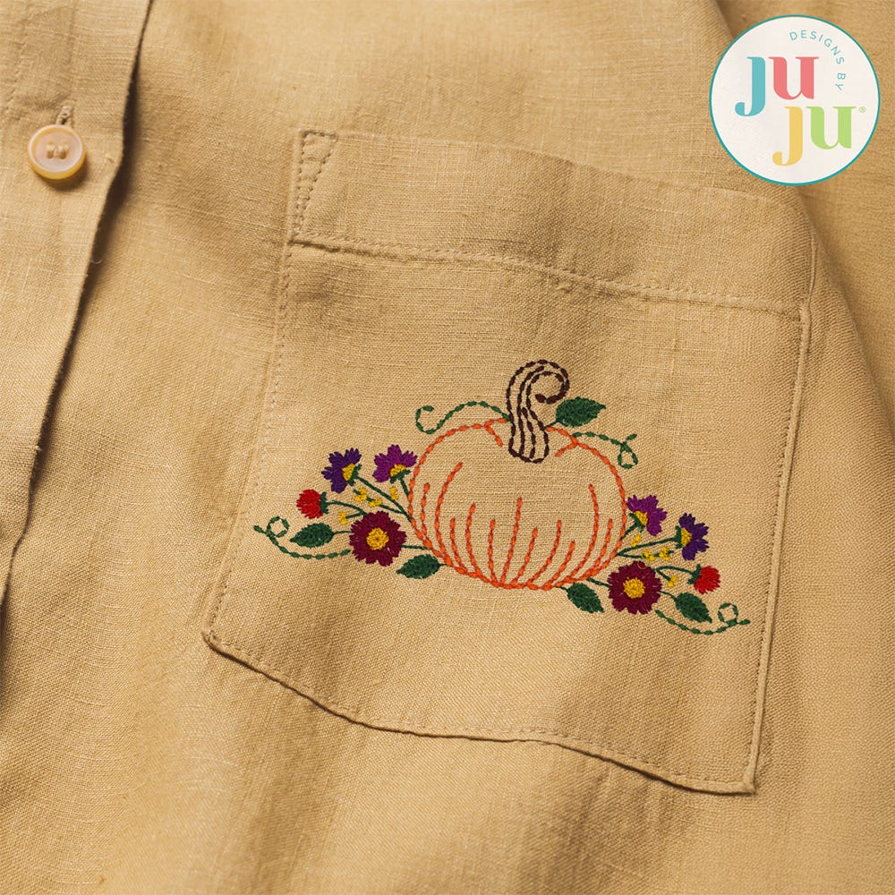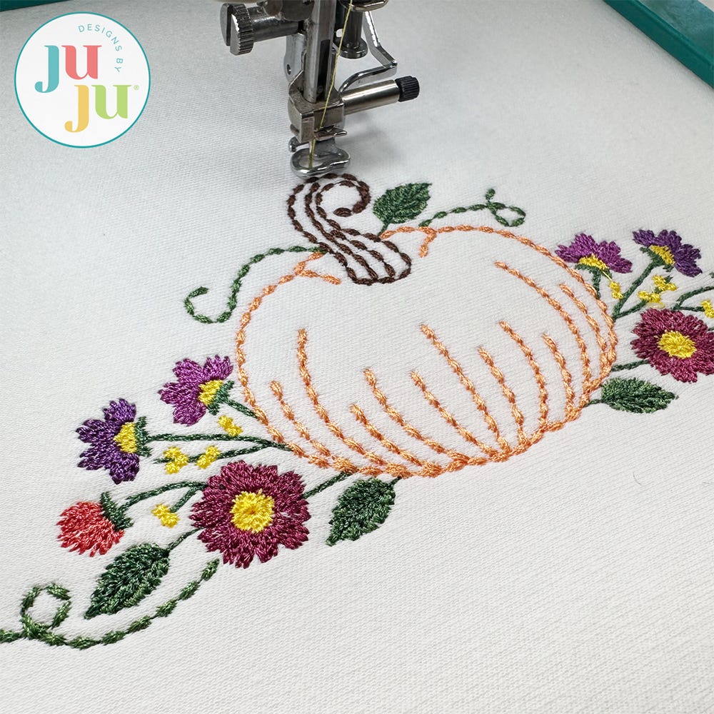 Meet our Heirloom Garden Pumpkin 2 design - perfect for adorning your Autumn embroidery projects. Taking center stage is a lovely pumpkin, done in a heavy bean (seed) stitch that gives a vintage hand-embroidered feel. Flowers and leaves, designed in a beautifully blended variety of embroidery stitch styles, flow gracefully from each side, creating the perfect finishing touch.