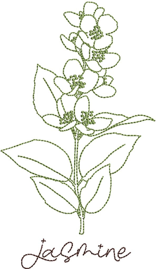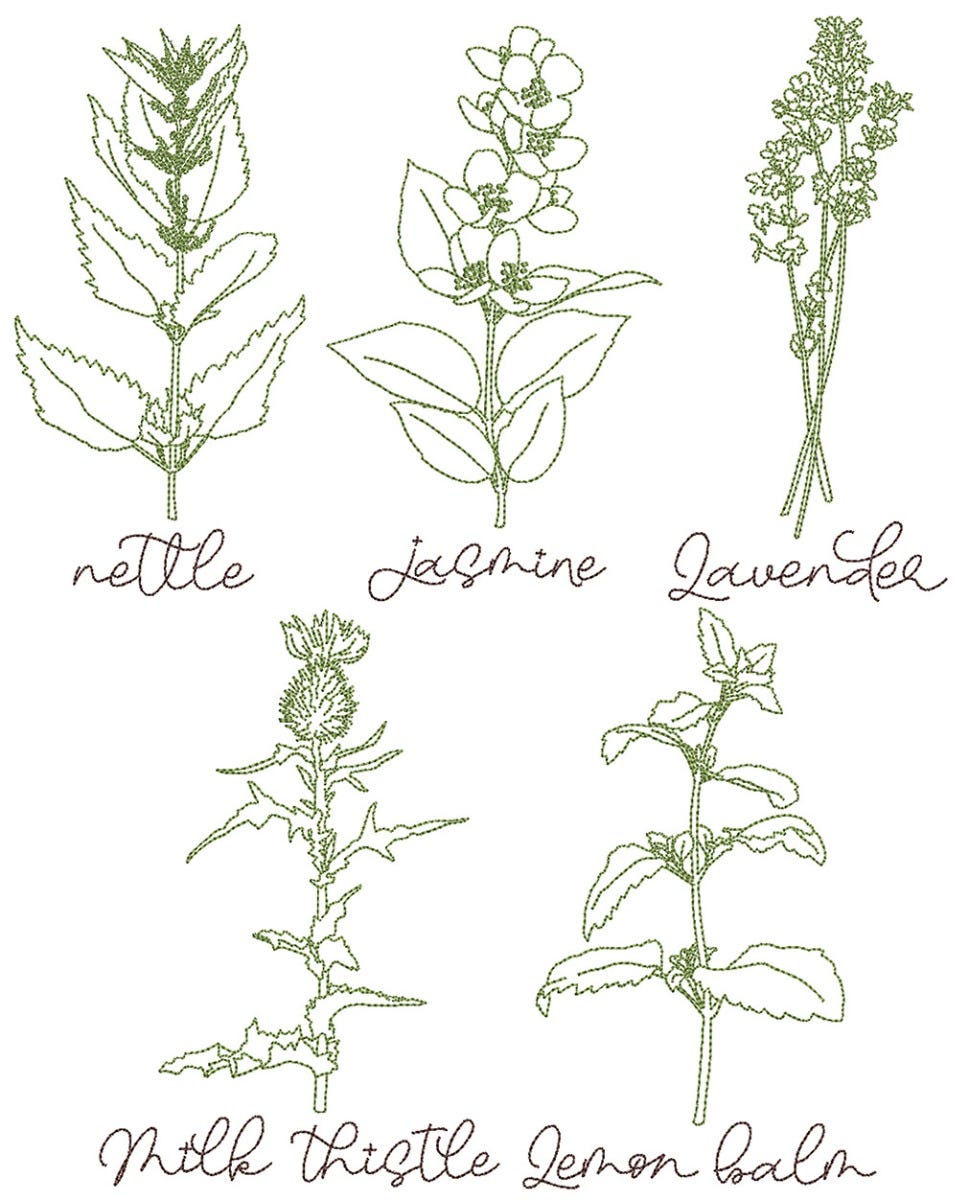 5 more simple and natural herbal designs! These designs are embroidery-only with triple bean stitch line art and lettering.