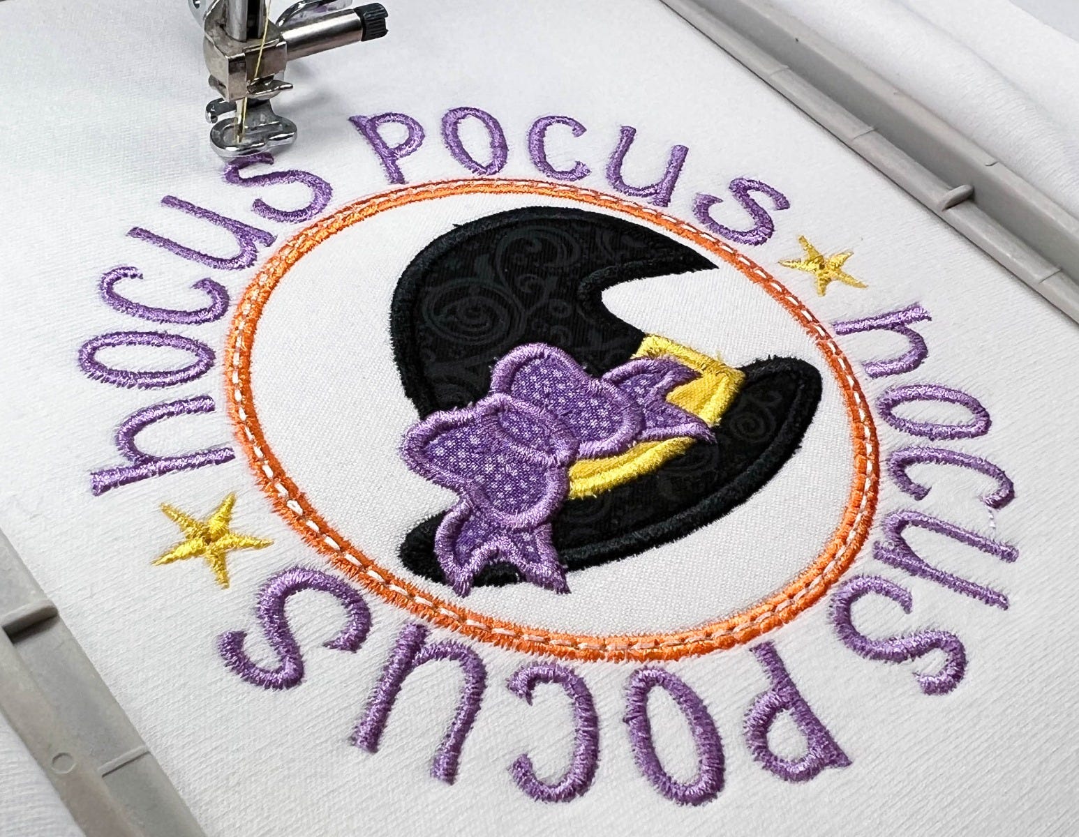 This four fabric applique features a bean stitch accent line on top of the satin stitches around the circles. The "Hocus Pocus" text is included in the design file.