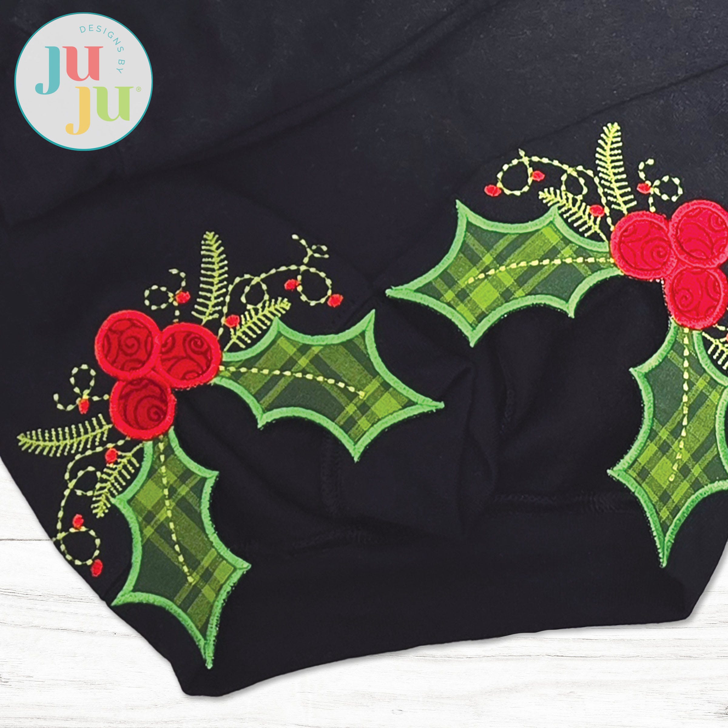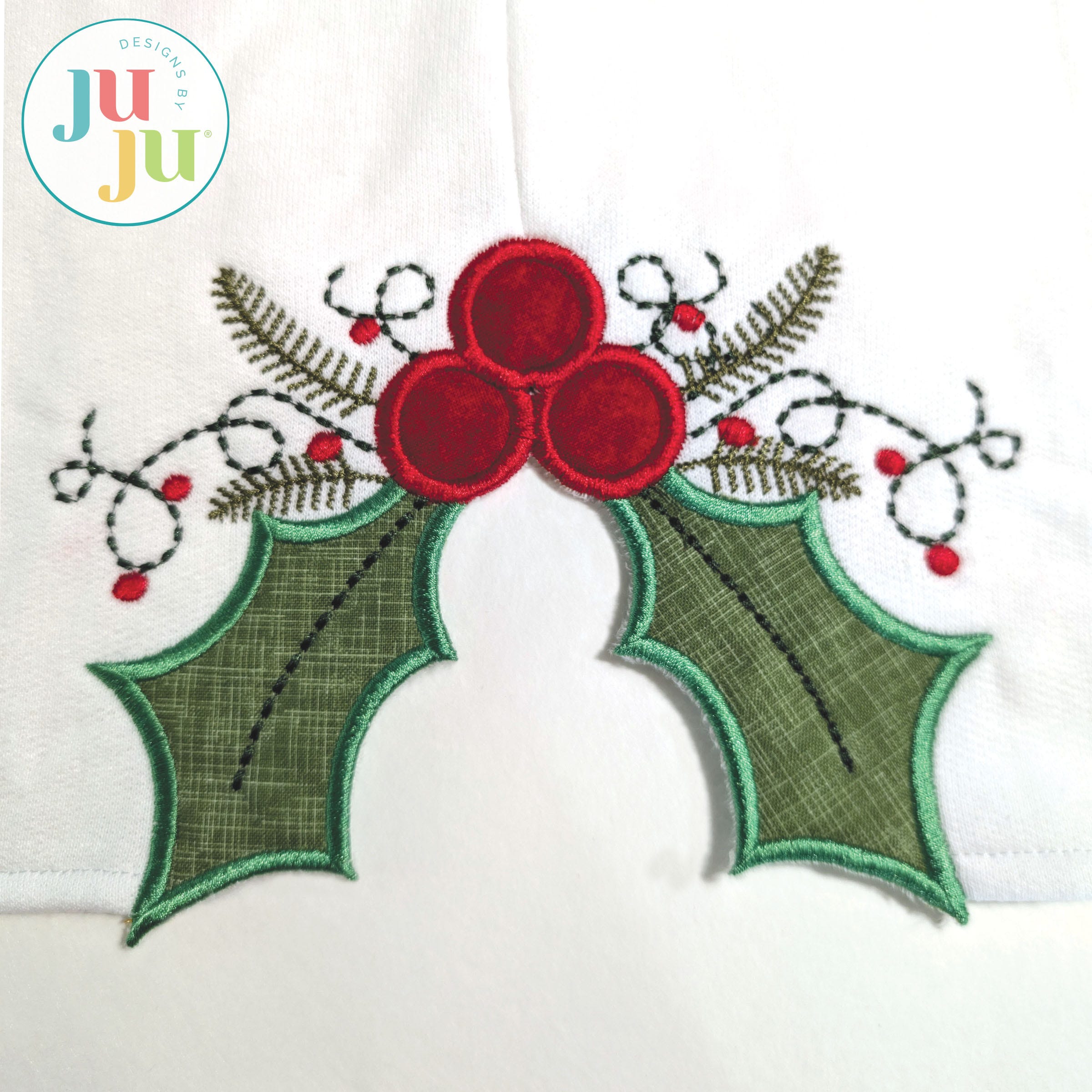 If you like the trendy side seam bow applique craze, you are going to love this Holly and Berries design! Perfect for Christmas tees, sweatshirts and more!