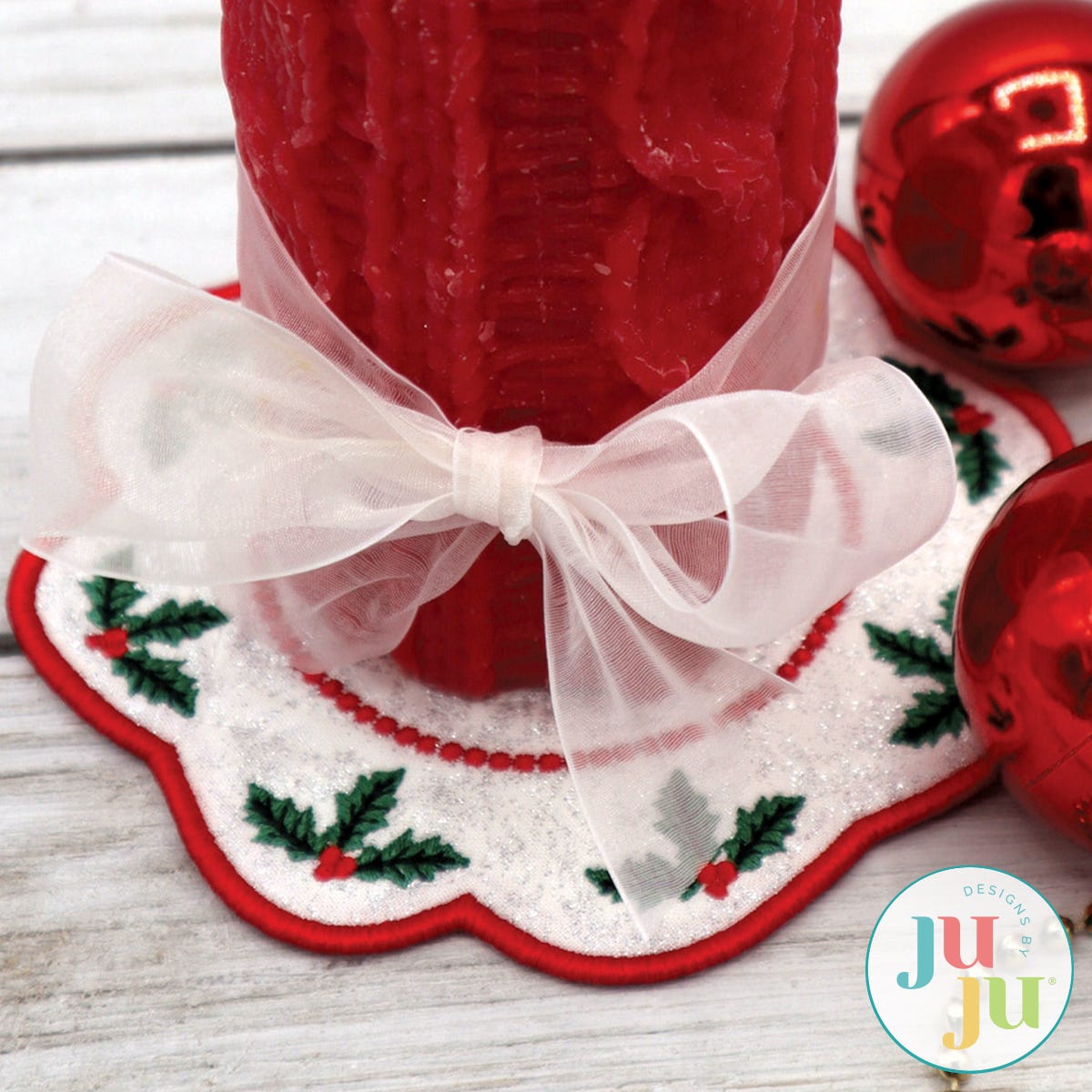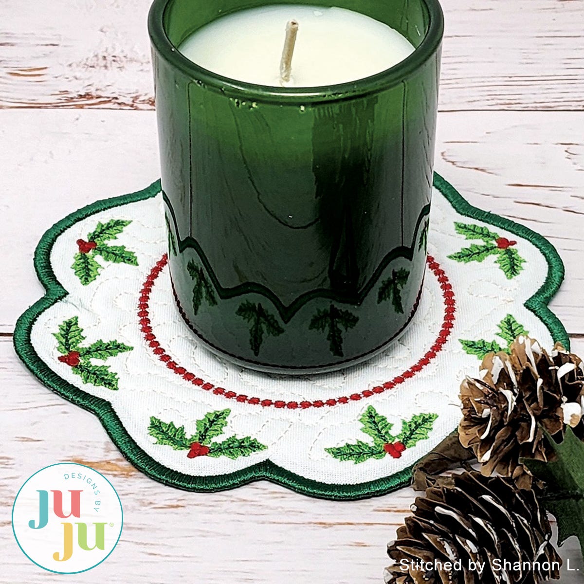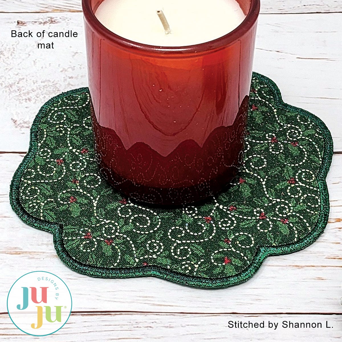 This beautiful candle mat is stitched in one hooping and requires no additional sewing machine or hand stitching. The mat is stipple quilted and the center is outlined with small French knot stitches.