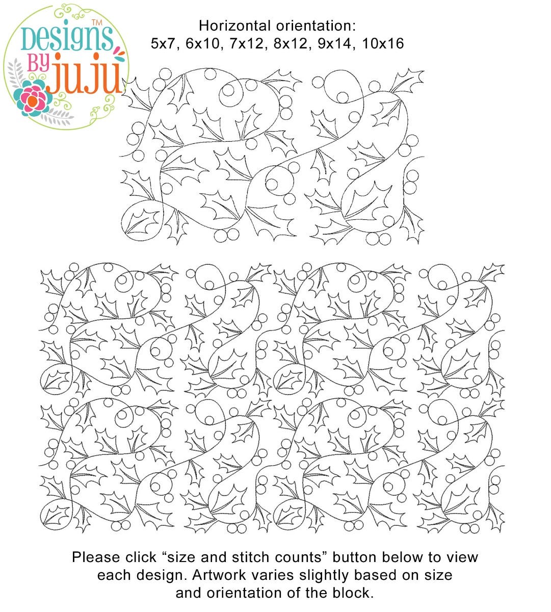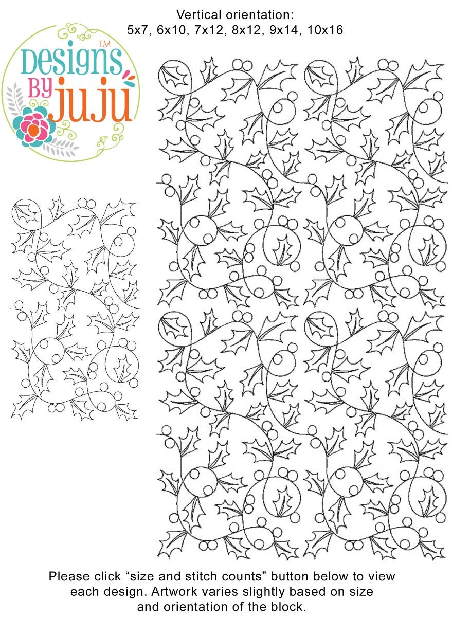 Please note: Both the scale of each pattern and arrangement of the motifs may vary based on the hoop size. Please click the "Size and Stitch Count" button to view the artwork for each size.