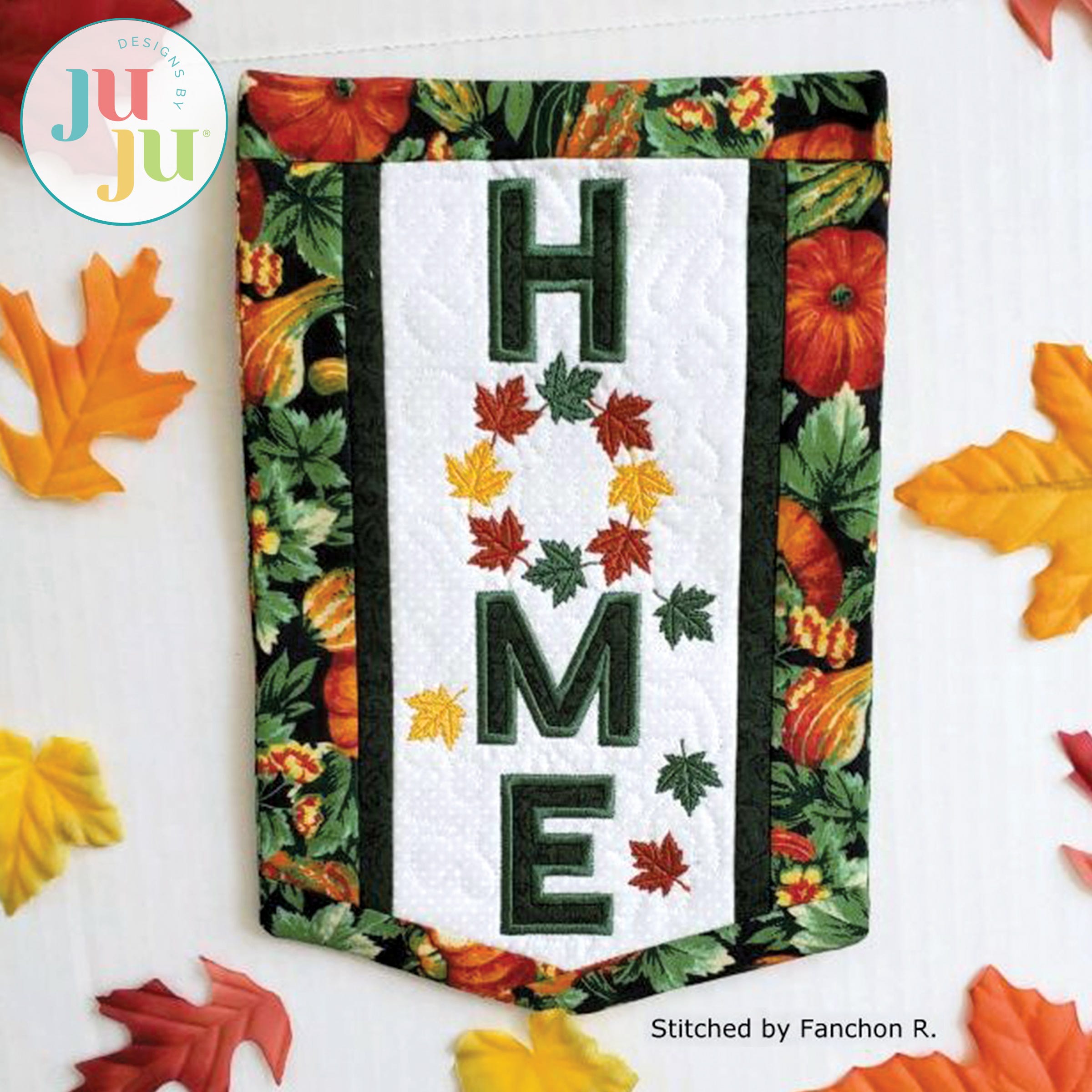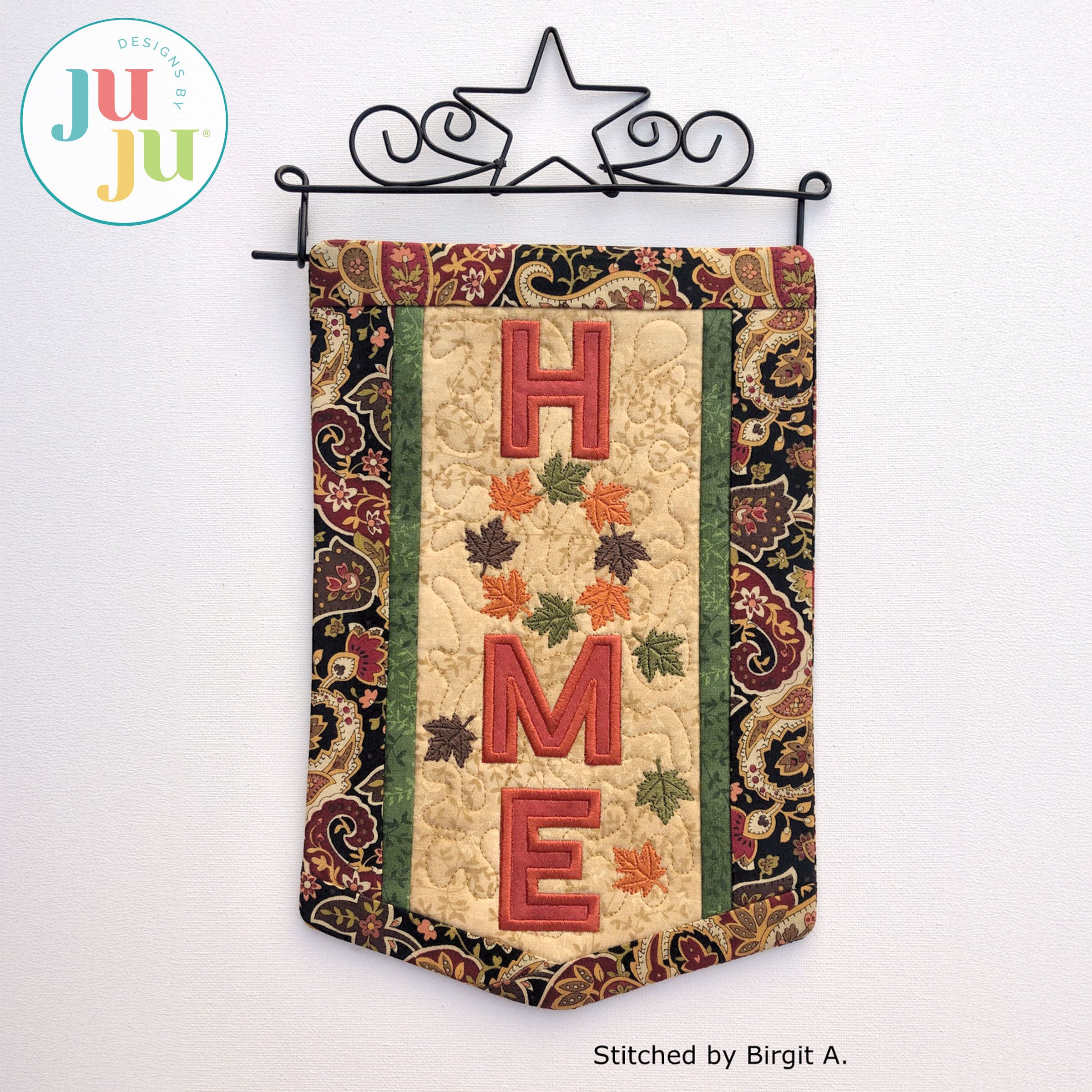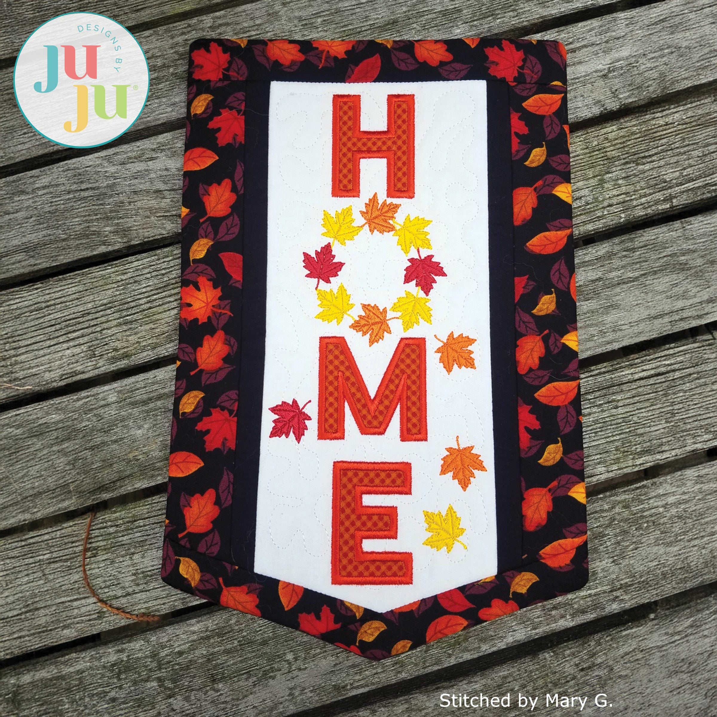 Decorate your home with this lovely banner to welcome autumn. The background is stipple quilted in the hoop and the letters H, M, and E are appliqued. The various borders get attached during the in the hoop process. There is a "sleeve" in the back for hanging the quilt. The sleeve, too, is applied during the embroidery process. No additional hand or sewing machine stitching required.