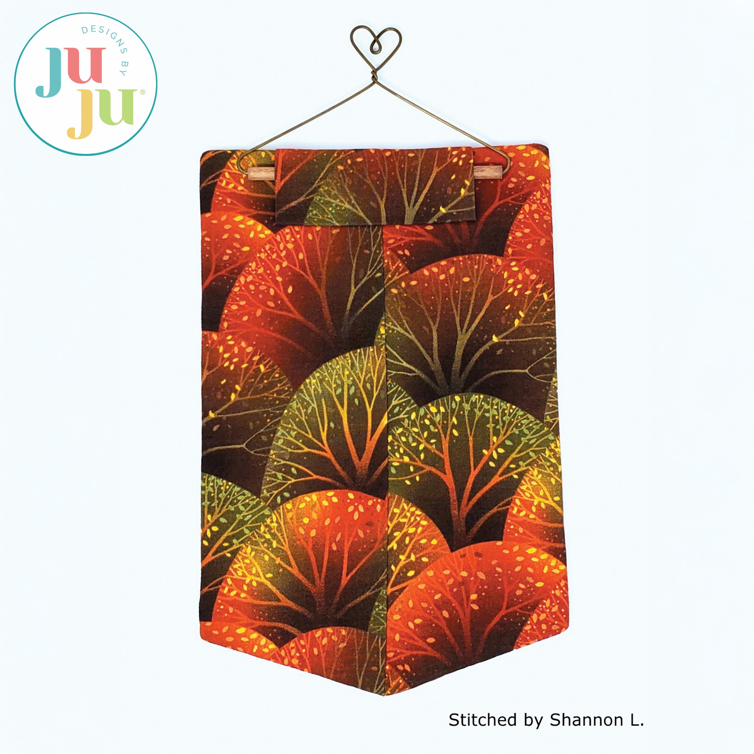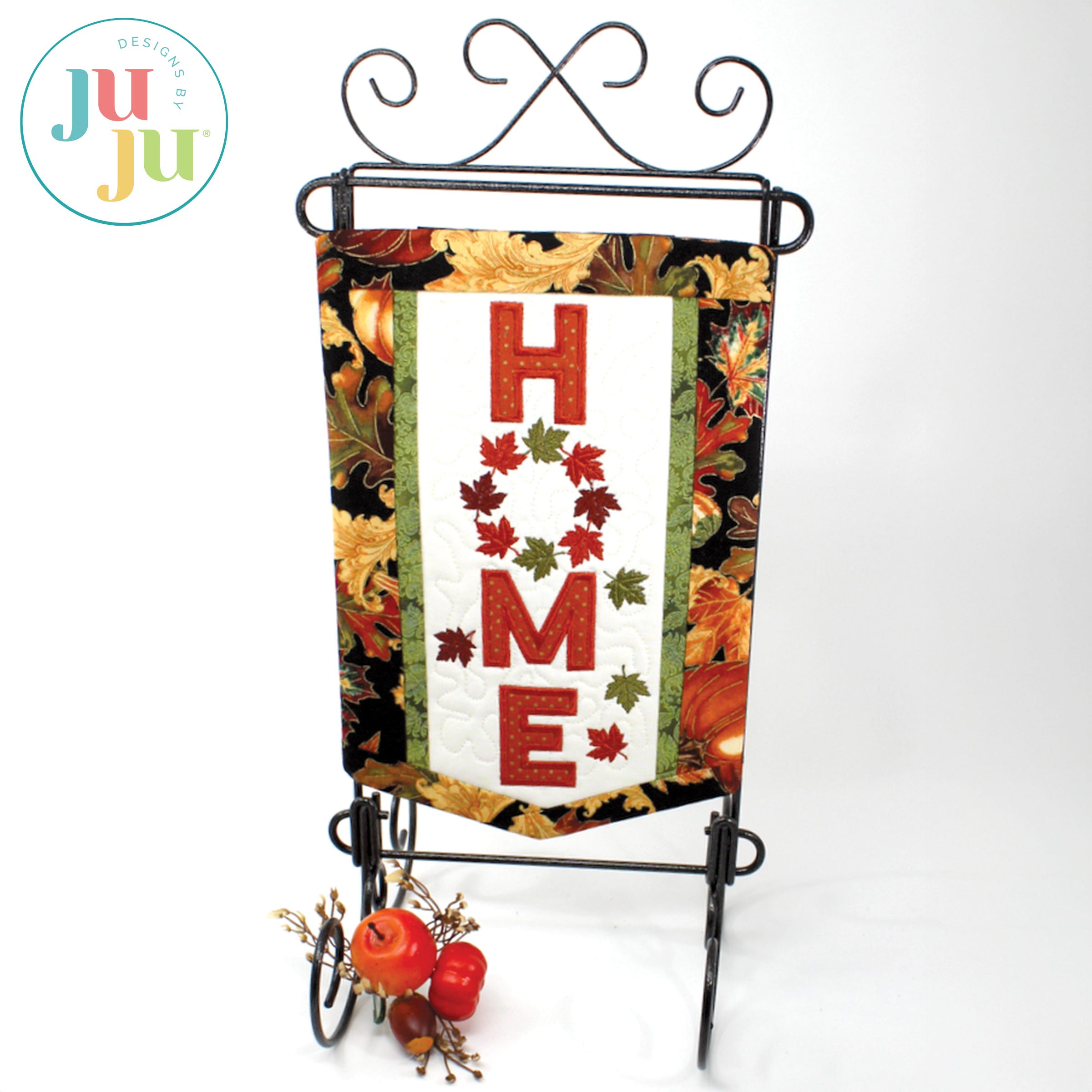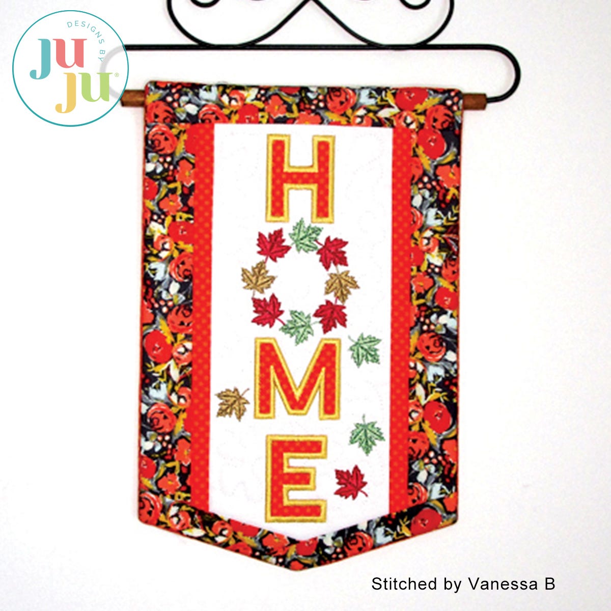 Decorate your home with this lovely banner to welcome autumn. The background is stipple quilted in the hoop and the letters H, M, and E are appliqued. The various borders get attached during the in the hoop process. There is a "sleeve" in the back for hanging the quilt. The sleeve, too, is applied during the embroidery process. No additional hand or sewing machine stitching required.