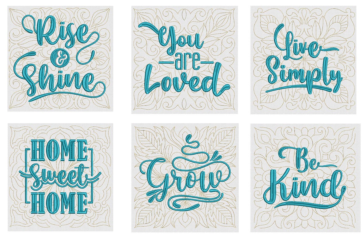 6 beautiful and welcoming quilt blocks!Ā These quilt blocks feature a double pass of running stitches for the quiltingĀ background and split satin stitch lettering. Please note: the pathing of the quilting lines includes running stitches under the text, therefore the text cannot be skipped.Ā