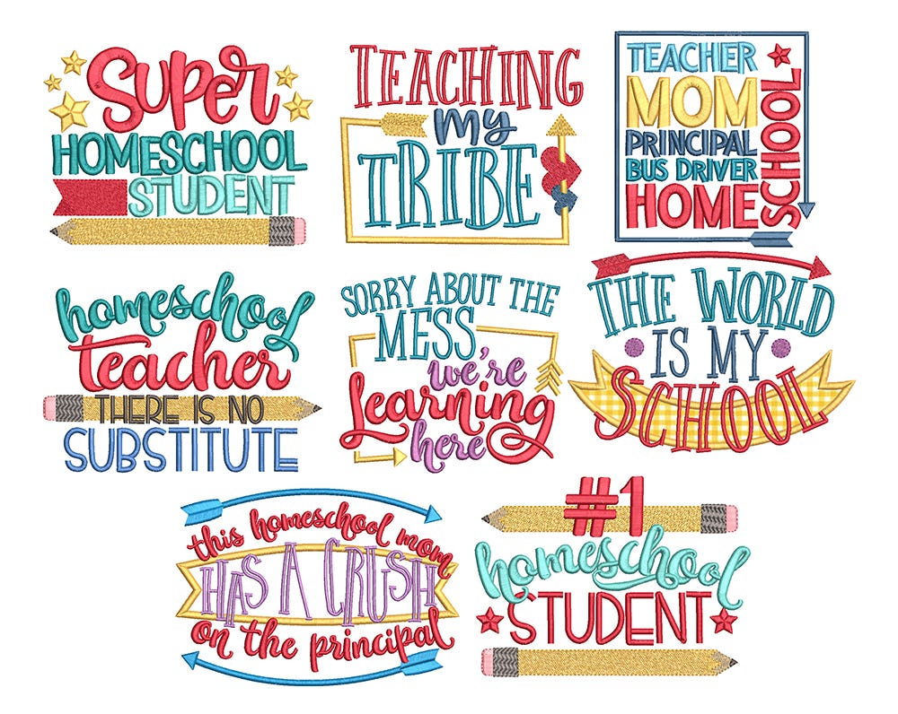 *Please note that the following designs contain applique components: The world is my school / This homeschool mom has a crush on the principal /