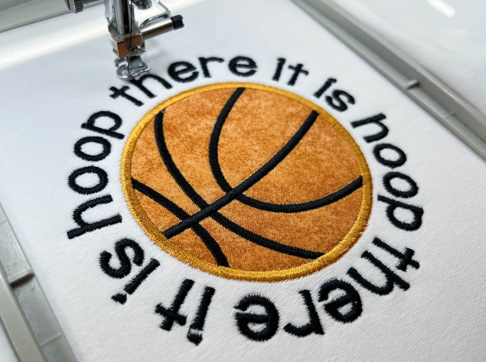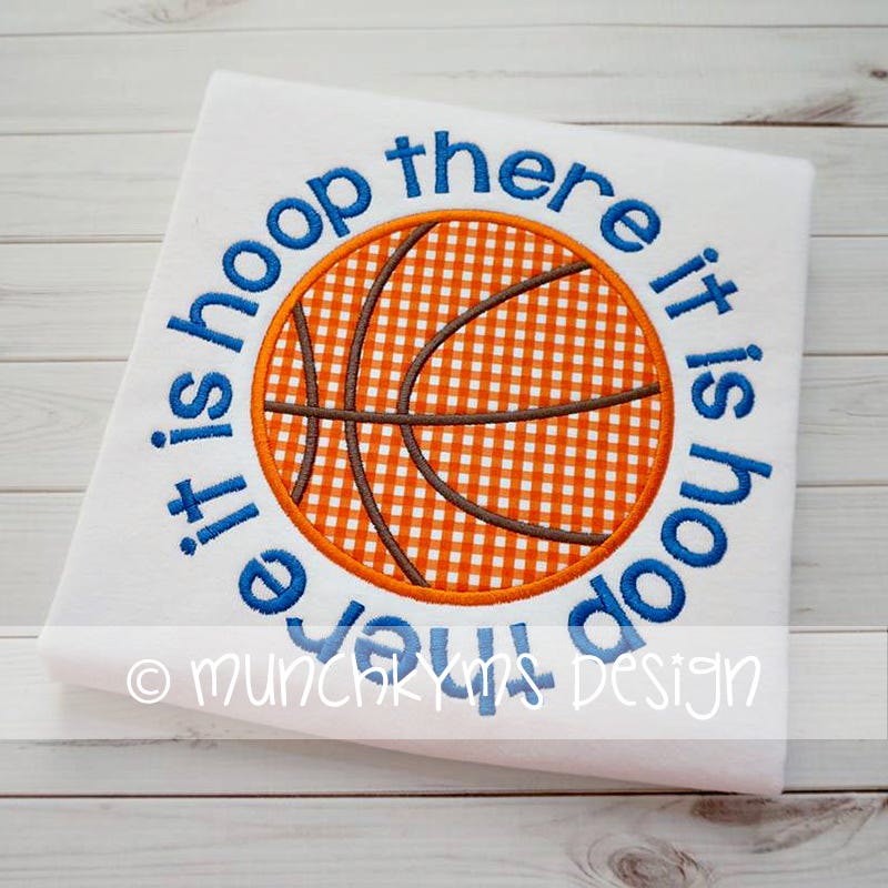 The "Hoop There It Is" text around the applique basketball is included in the design file.