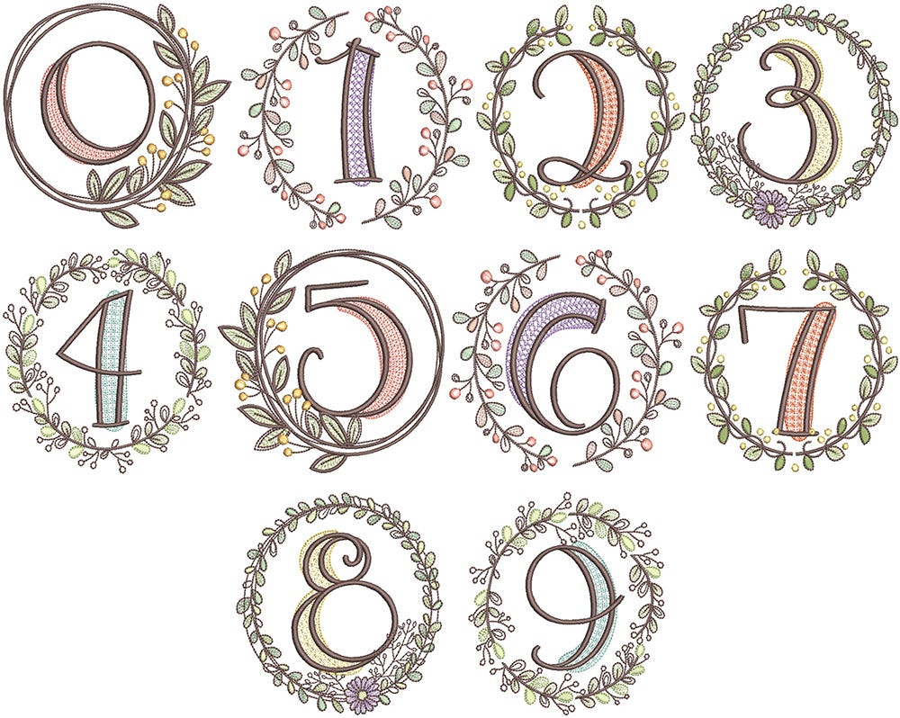 Hope Laurel Numbers are embroidery-only with a blend of satin, fill, motif and bean stitch design elements. The satin stitch number is intentionally offset from the motif fill as part of the stylistic artwork. There is one file per letter, as pictured.