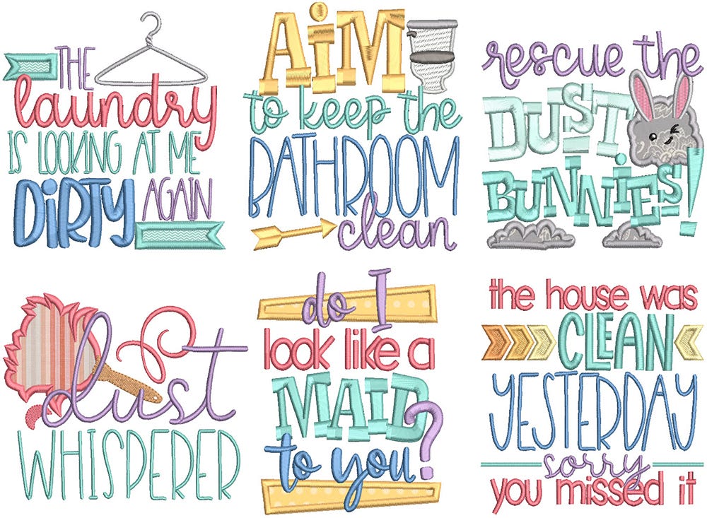 *Please note that the following designs contain applique components:Ā The laundry is looking at me dirty again / Rescue the dust bunnies / Dust whisperer / Do I look like a maid to you? /Ā
