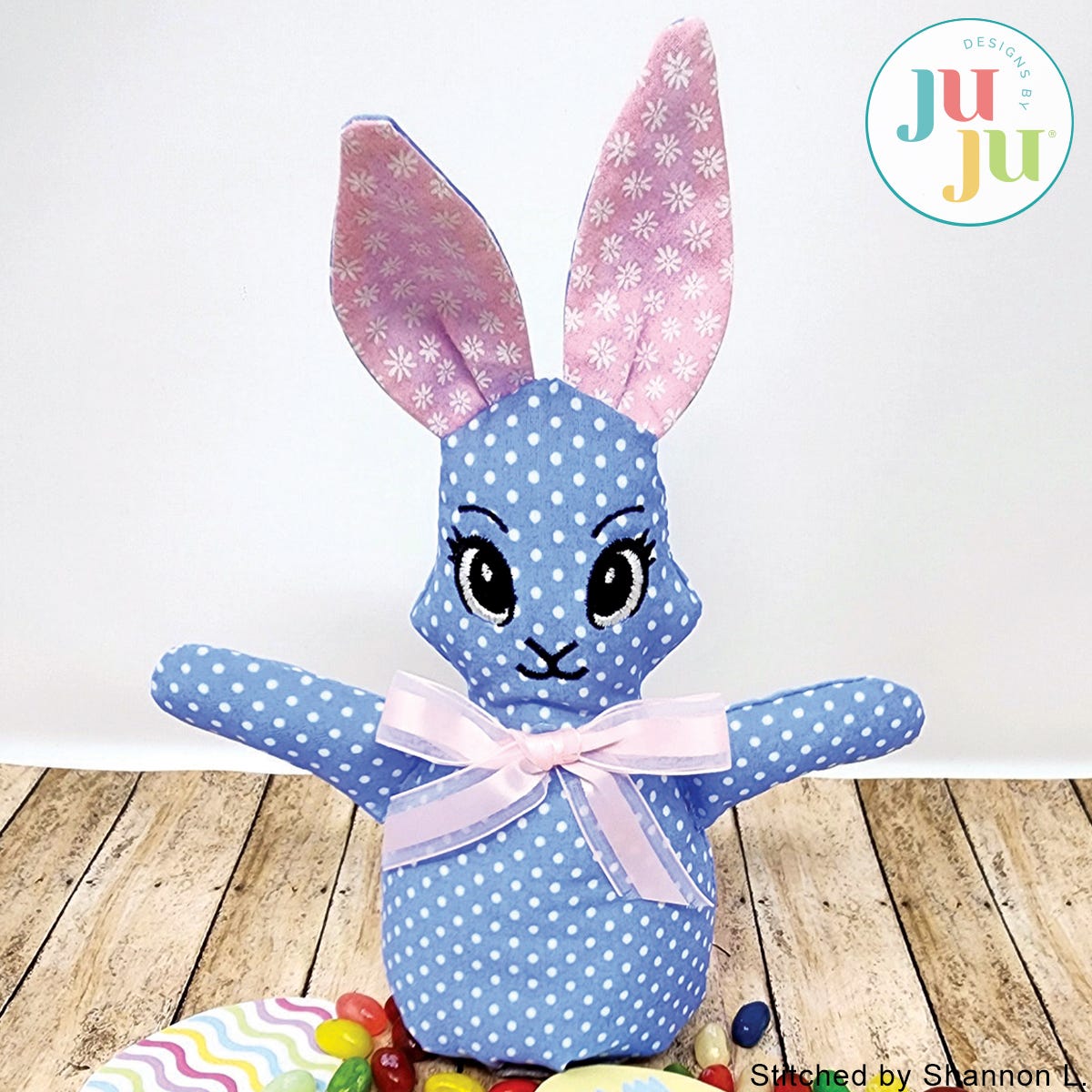 Now here is a fun way to decorate for Spring. This little bunny is stitched in two hoopings. Digitized for use with cotton fabrics.