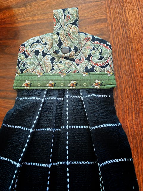 This towel topper in the hoop design is specifically for the 5x7 hoop and is made in 4 hoopings. The finished width is 5.5 inches.