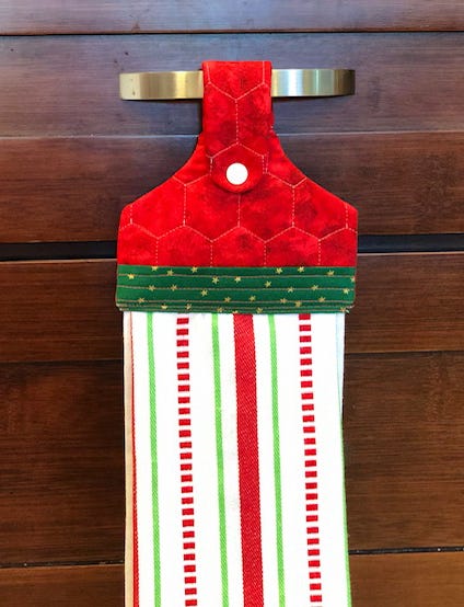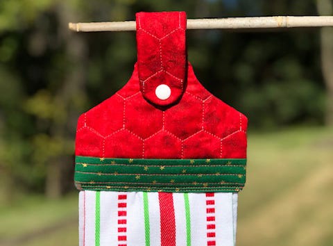 This towel topper in the hoop design is specifically for the 5x7 hoop and is made in 4 hoopings. The finished width is 5.5 inches.