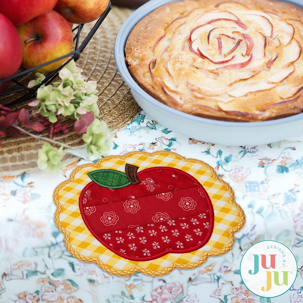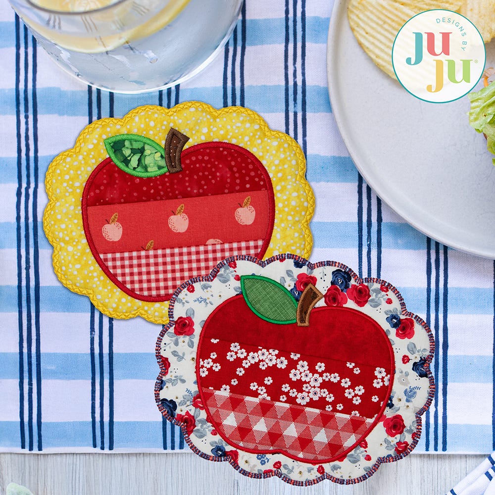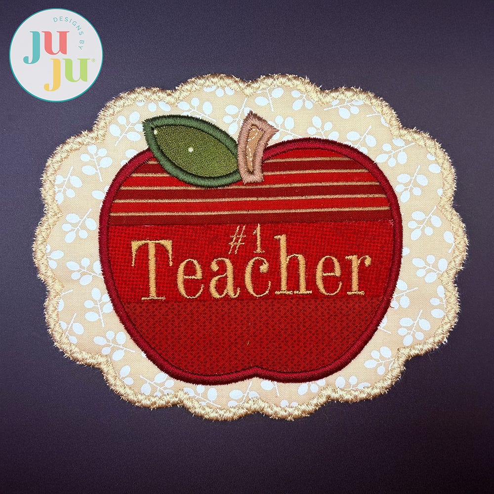 This mug rug features an applique apple. It has a satin stitch edge and is stitched on woven water soluble stabilizer. Made in one hooping with no additional sewing required! Complete step-by-step PDF photo tutorial included with your download.