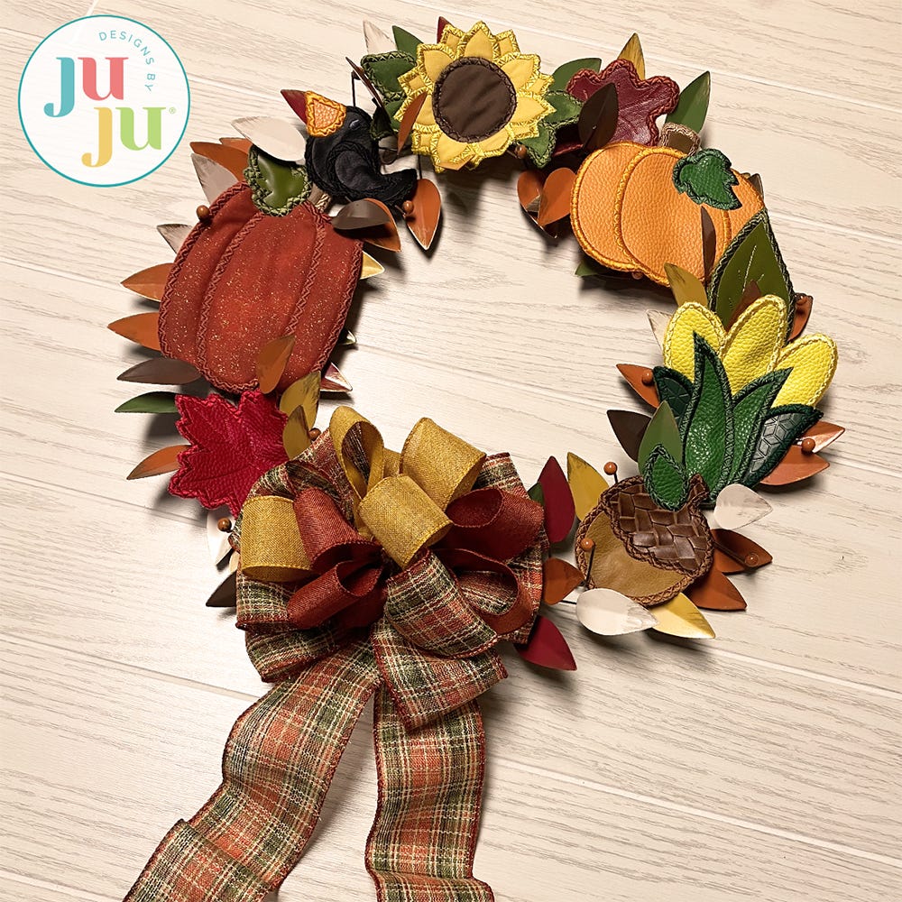 Each unit is made in its own hooping, stitched on water soluble stabilizer to be free standing. Our suggested layout includes an acorn, crow, corn bundle, sunflower, two pumpkins, and three leaves slightly overlapping to form a wreath shape. Use hot glue to attach the units to each other, or hand sew them together. You can secure the units to a ring cut from foam core or a wire base for added stability (12" ring for 5x7, 14" ring for 6x10, 18" ring for 7x12). Mix and match as many (or as few) designs as you like to create a wreath that's uniquely yours!
