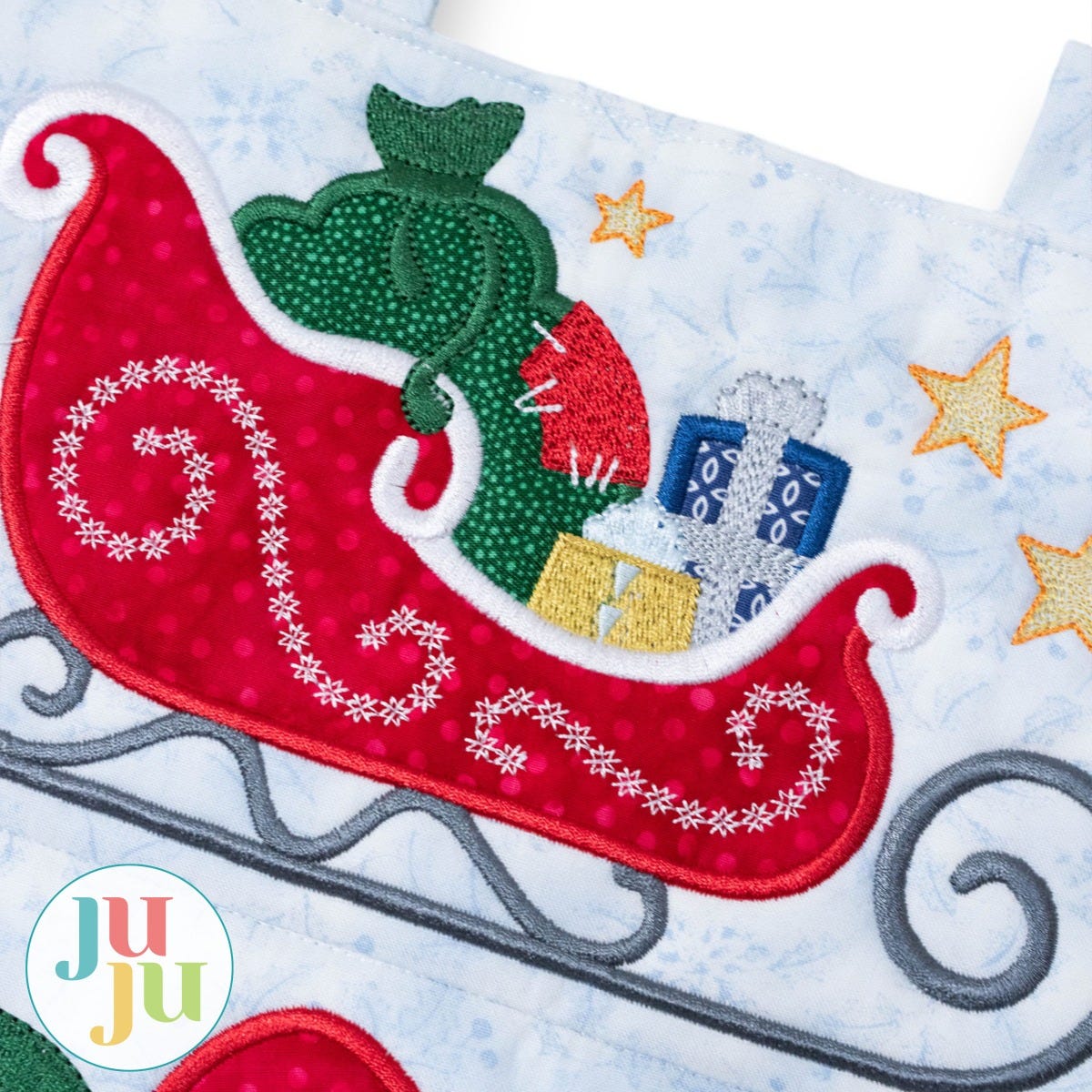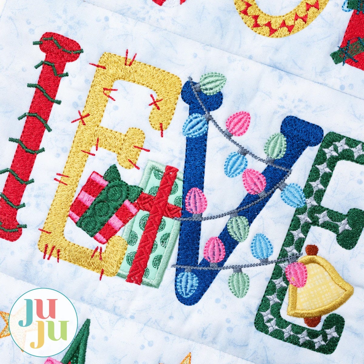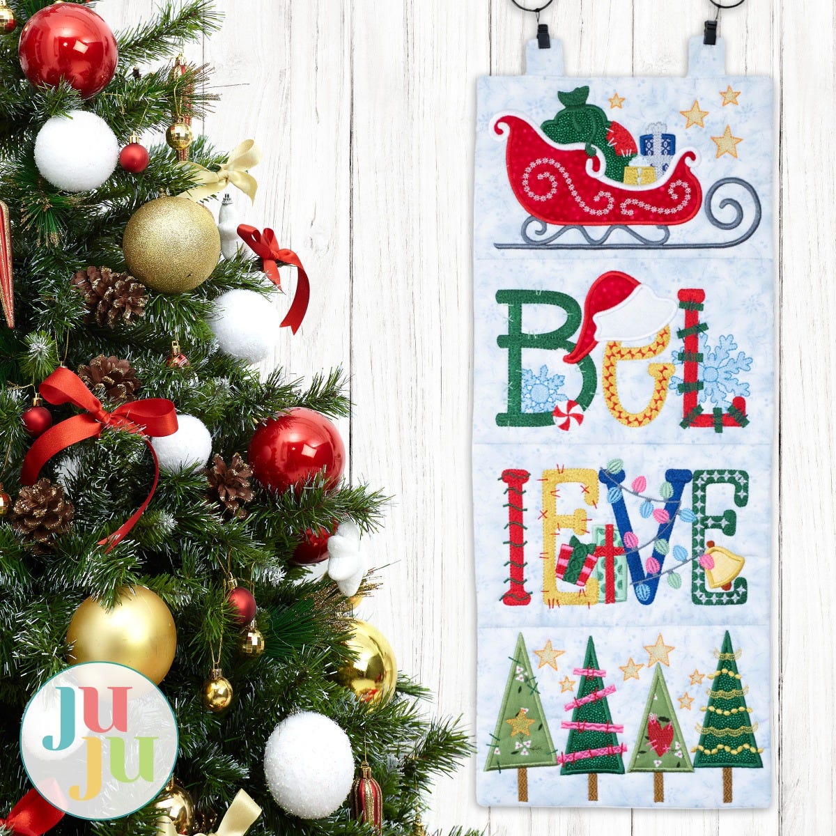 Believe in the magic of Christmas! This wall hanging features an applique sleigh at the top and applique trees at the bottom. The fill stitch lettering has both applique and embroidered accents.