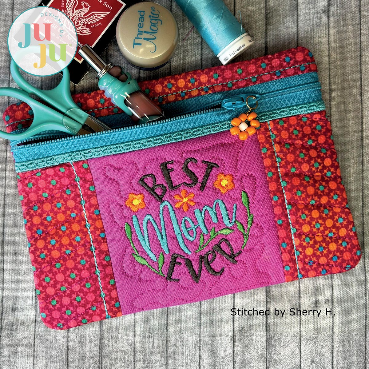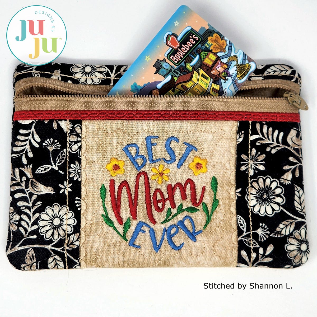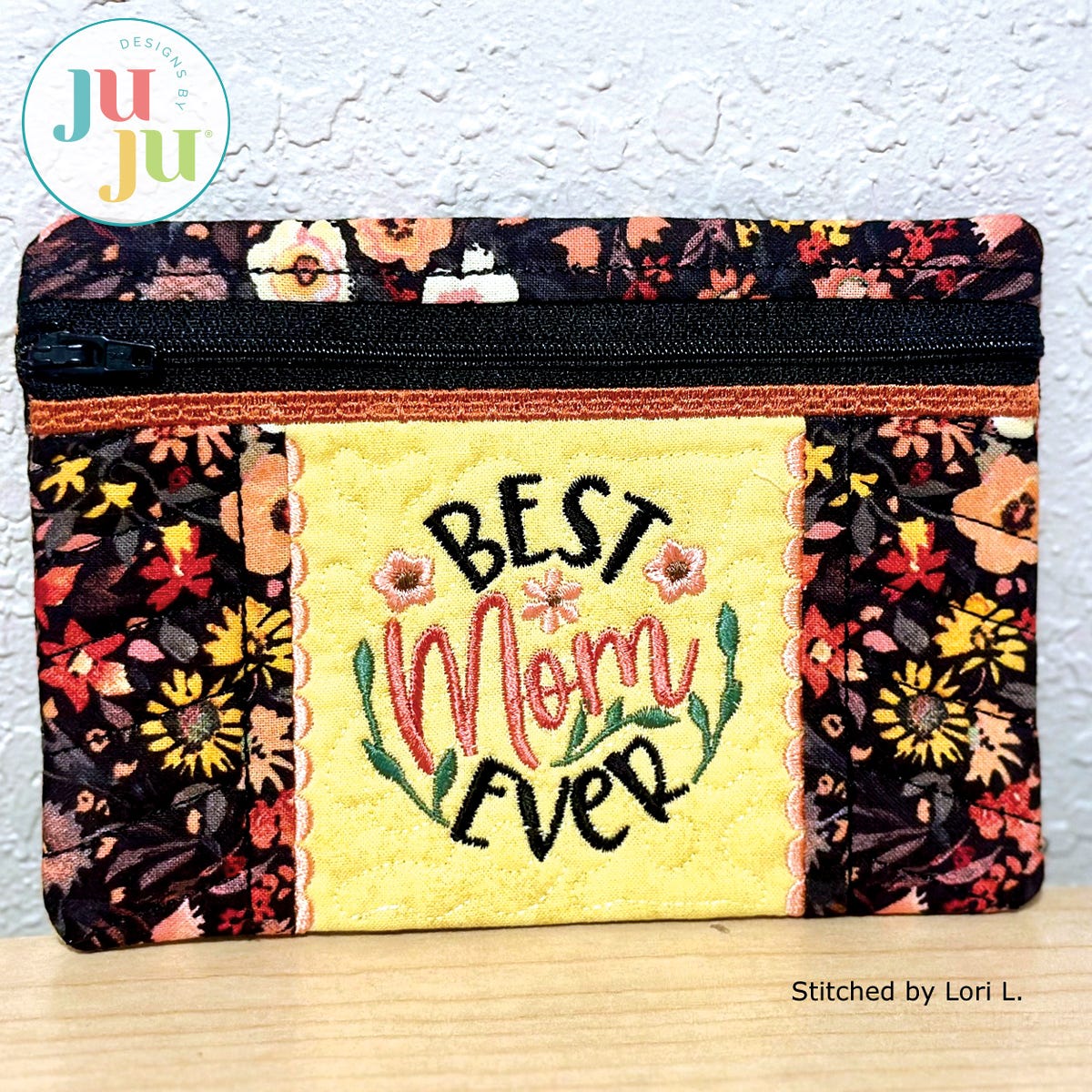 This zippered bag is stitched in two hoopings. Both the front and back are quilted. The front center design also comes in a "Mum" version. At the bottom of the back there is the wording "You make the world a better place." You can skip the words in the back and just use two different fabrics for the top and bottom. This bag is also included without the front center design and the small lacy edge, making it very versatile. A perfect gift for Mother’s Day, birthdays, teacher’s gift etc. No font included with your purchase.