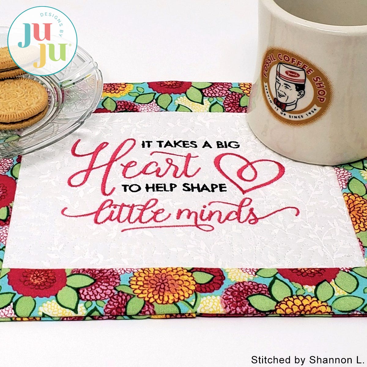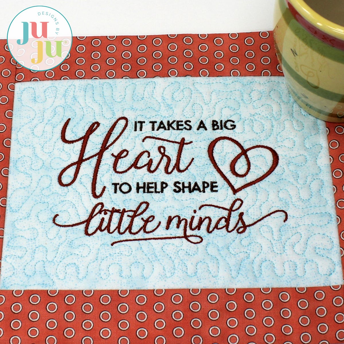 Do you want to show appreciation to a teacher? Here is one way to do it. This mini placemat is about 1/2 the size of a regular placemat and quite a bit larger than our 5x7 mug rugs. It can be rolled up and placed into a lunch box. The mats accommodate a dessert plate and mug easily.