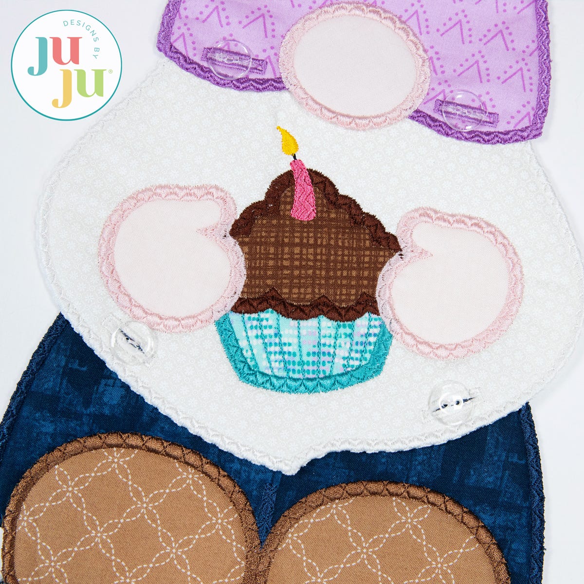 Requires 3 hoopings: the gnome's party hat with nose, beard with cupcake, and pants are stitched entirely in the hoop. The only additional hand sewing required is adding buttons once the pieces are complete.