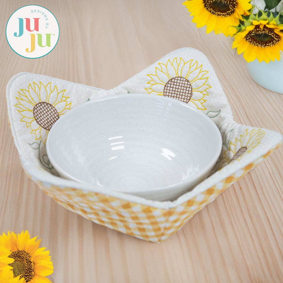 Protect your hands from a hot bowl of soup or a cold bowl of ice cream with a Bowl Cozy! This set includes two different stitch styles: a stipple quilting pattern and a sunflower design.