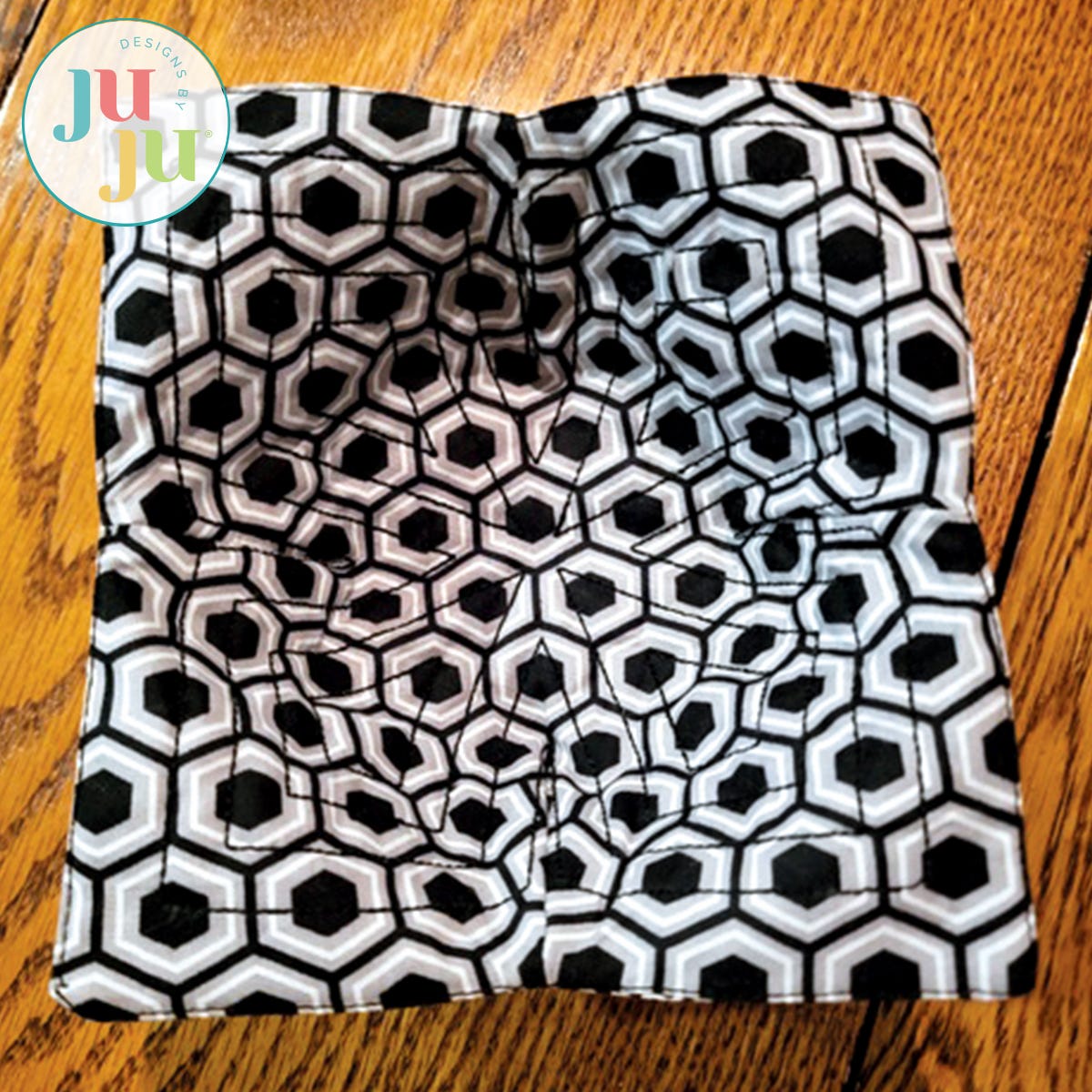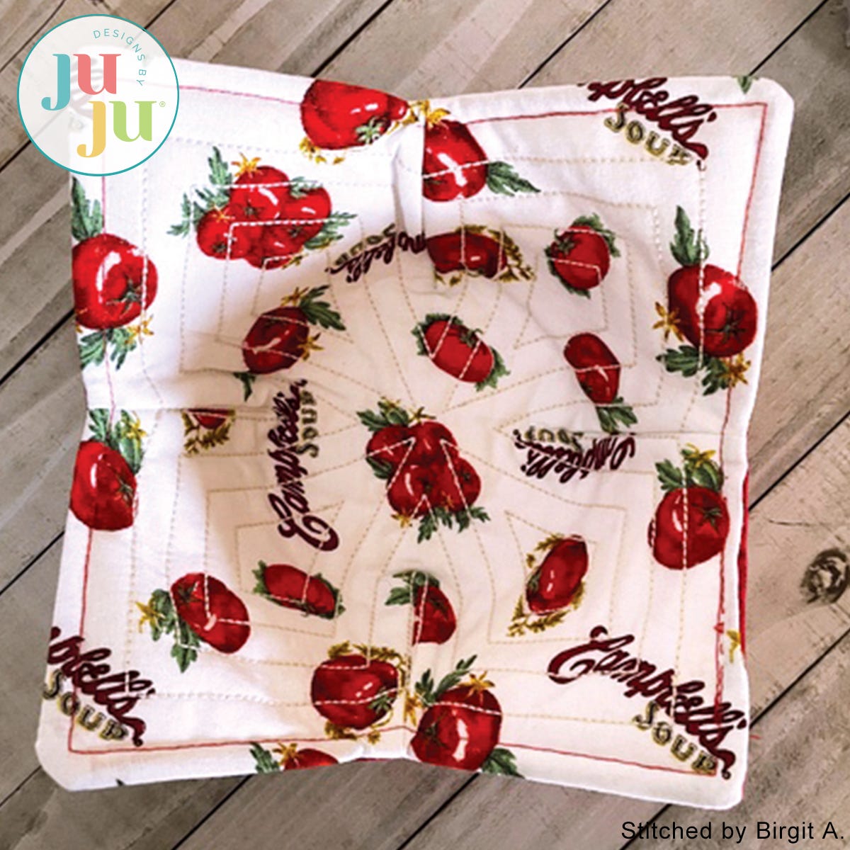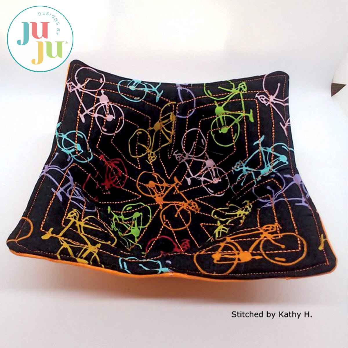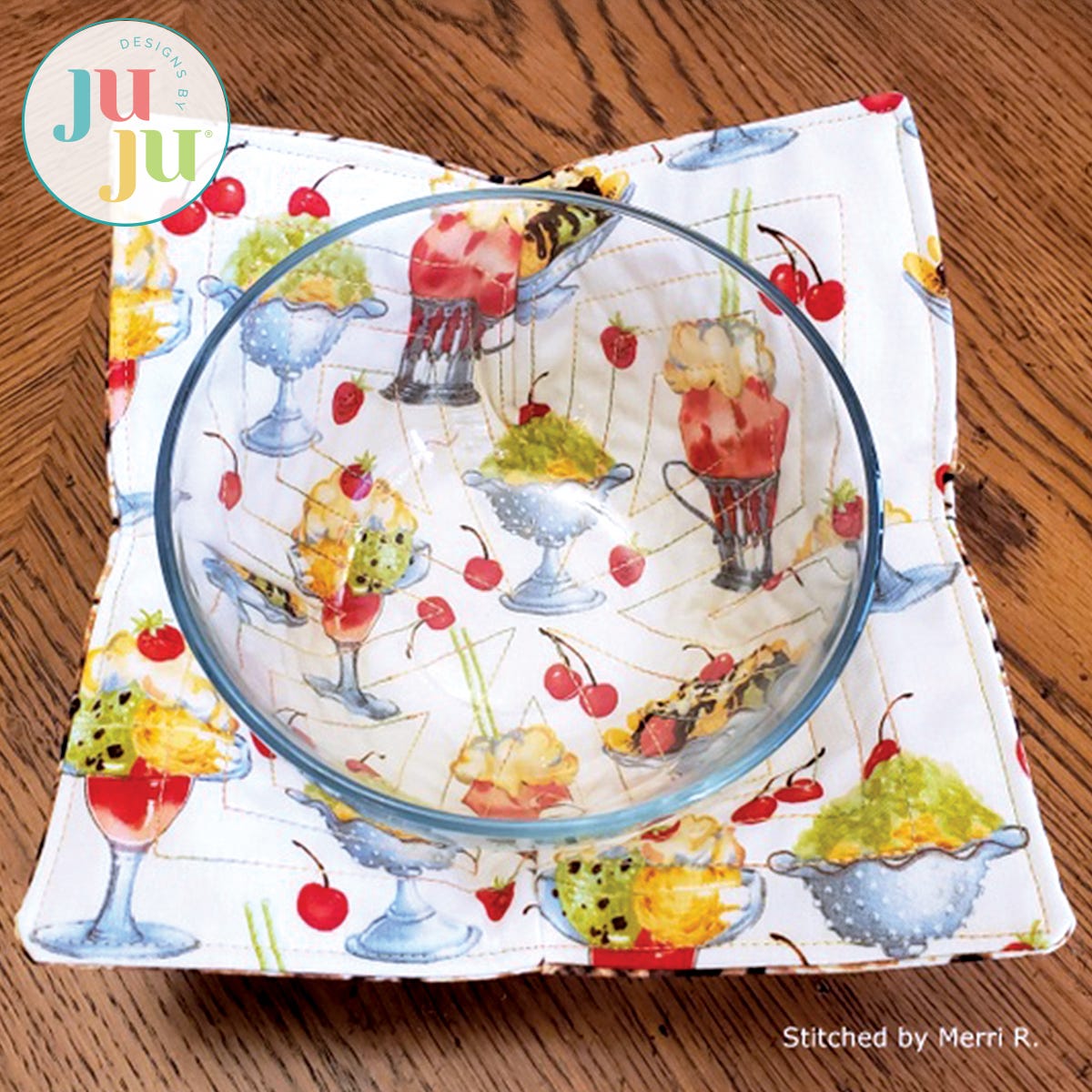 Are you looking for a small anytime gift for friends and relatives? This bowl hugger may fit the bill. The quilted hugger will protect your fingers from the heat of the soup or the cold of ice cream. If you wish to place the hugger into the microwave with a bowl to heat up soup, please note that all materials used (fabrics, batting, threads) will have to be cotton. This is a partial in the hoop project. You will construct the inside and outside of the bowl hugger in two, very quick separate hoopings. The fabrics get quilted in the hoop and then you will finish the bowl hugger on the sewing machine. The bowl hugger is reversible and fits several small bowl sizes.