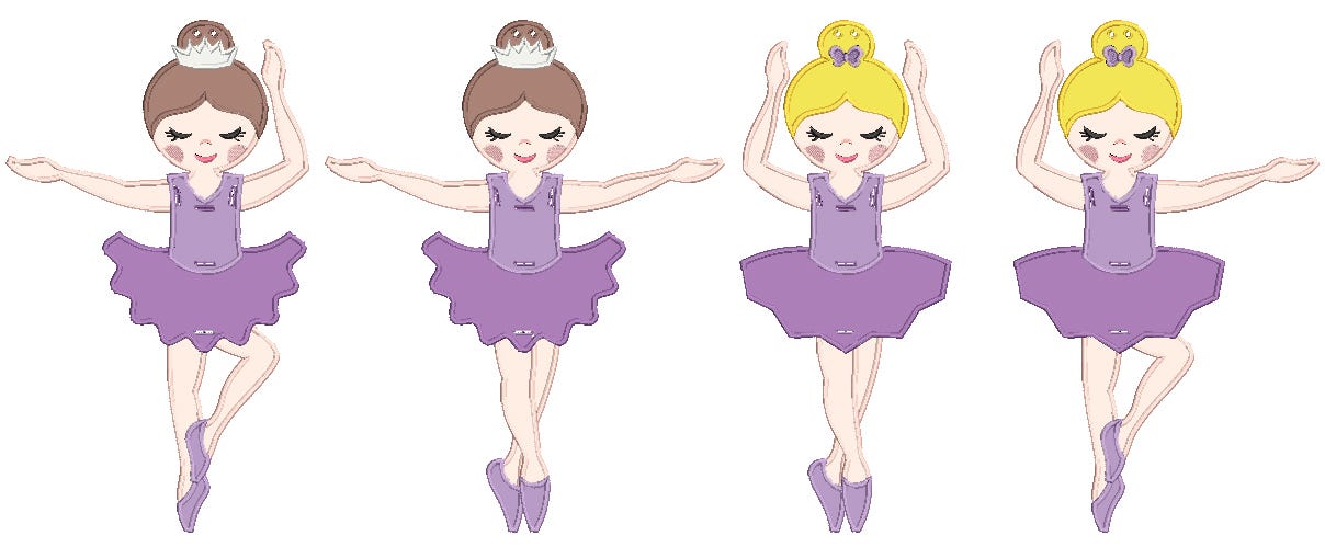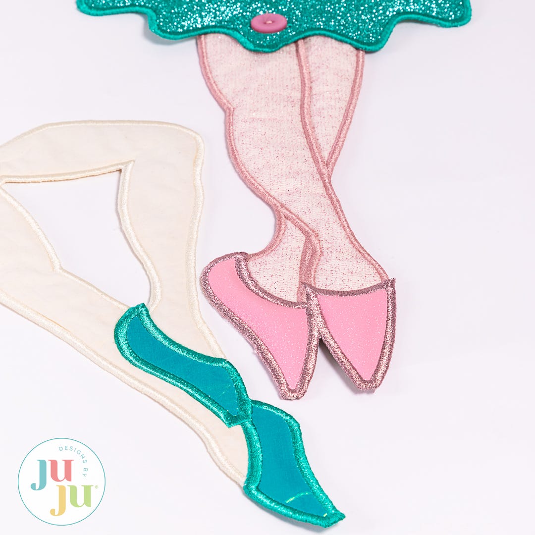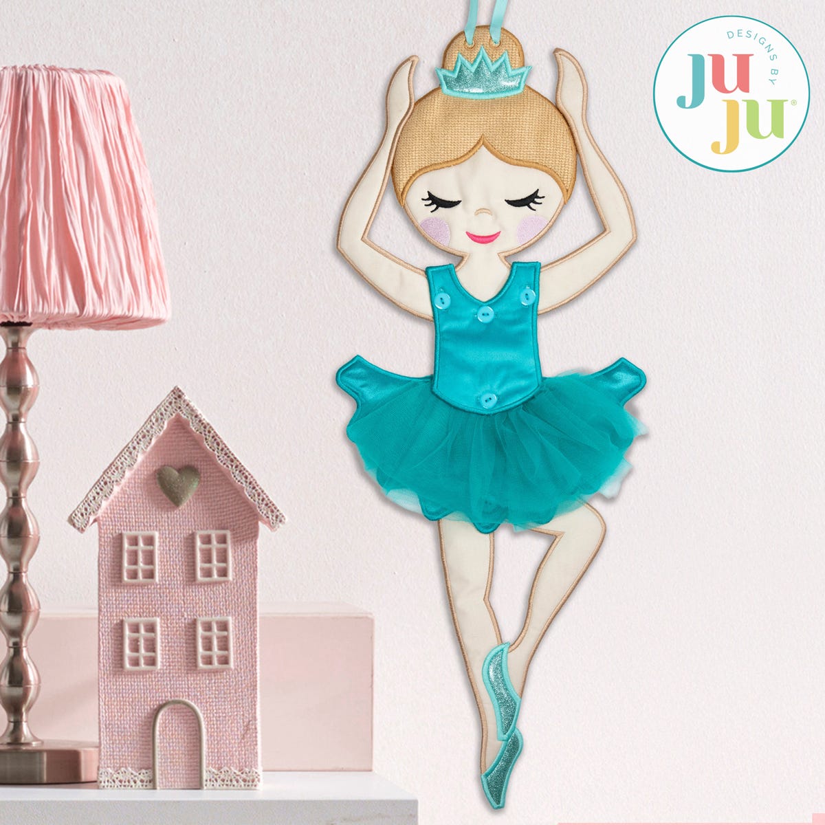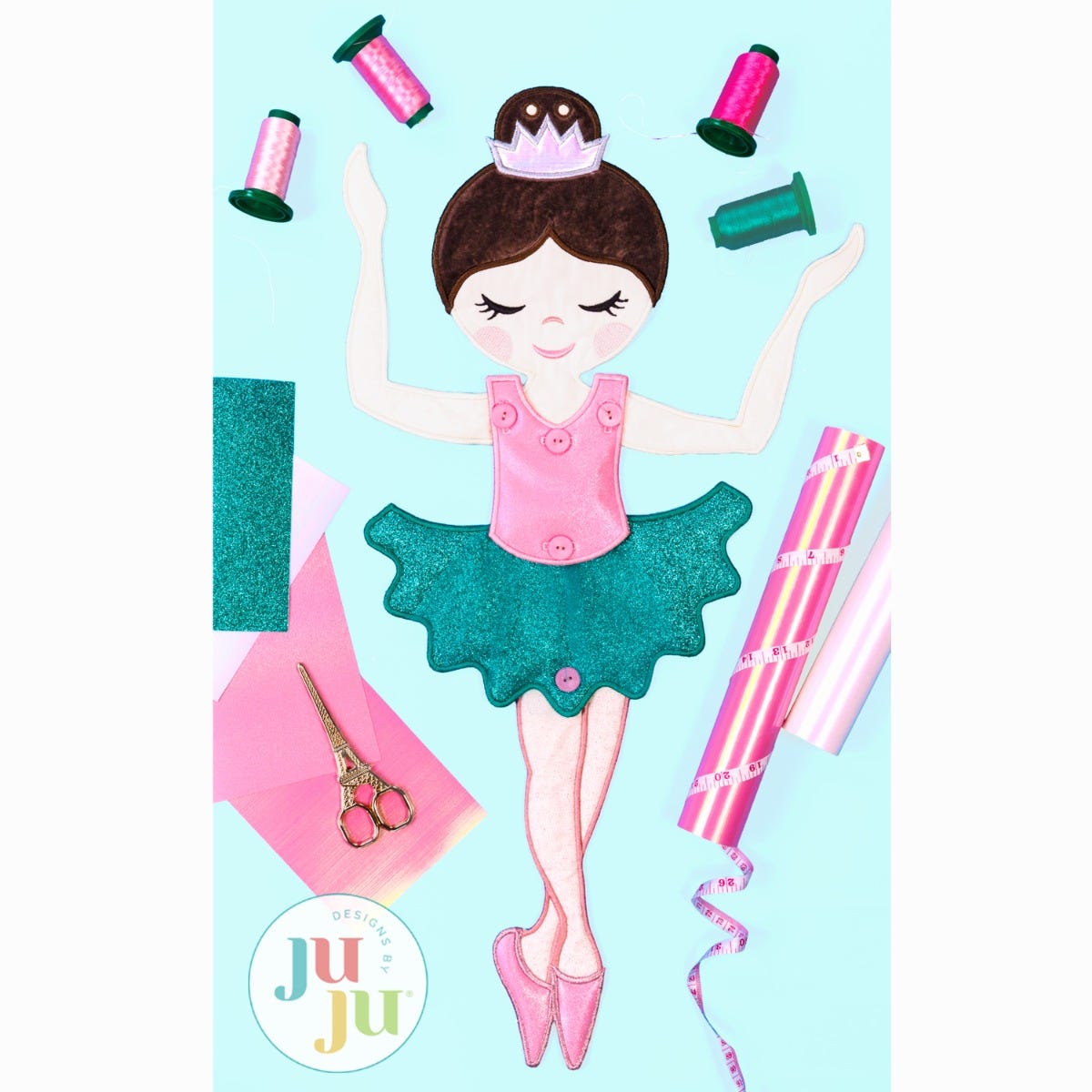 Made in 5-6 hoopings: the ballerina's head, bodice, skirt, arms and legs are stitched entirely in the hoop. The only additional hand sewing required is adding buttons once the pieces are complete.