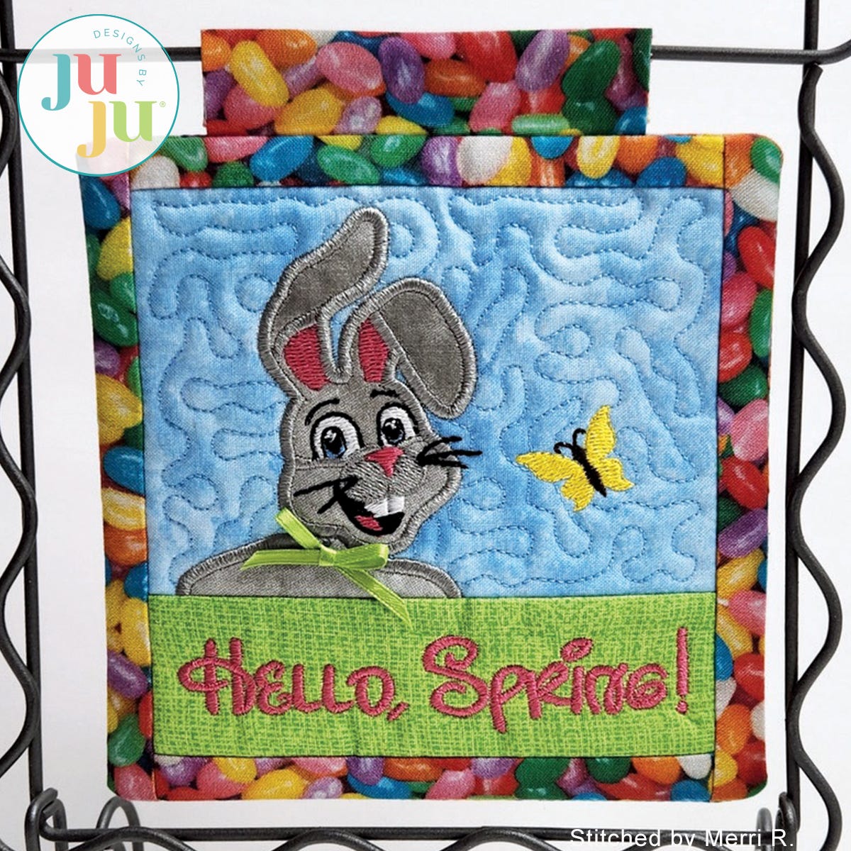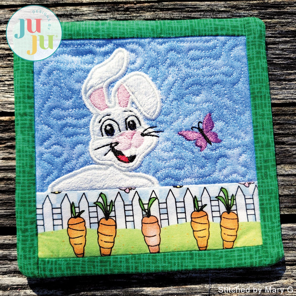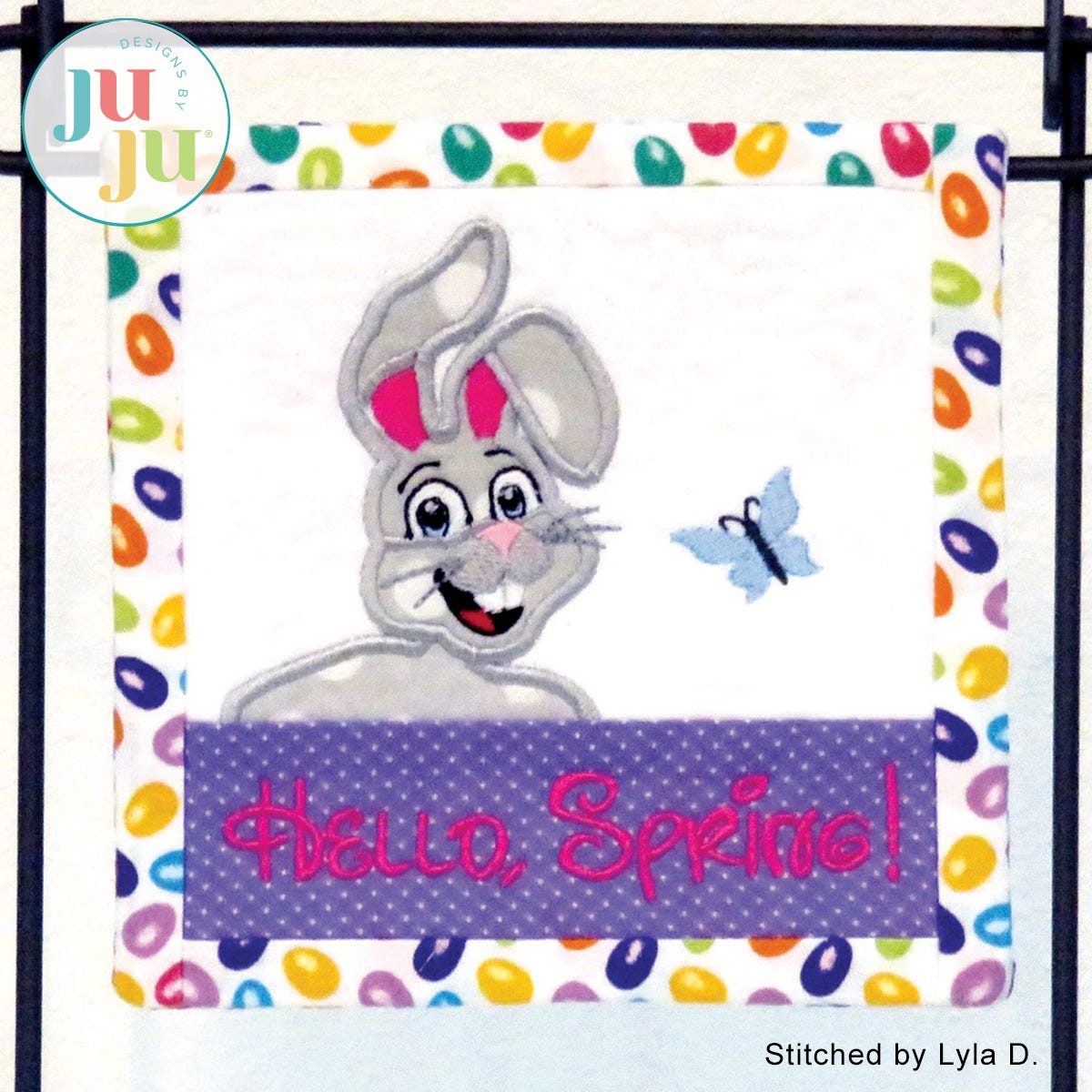 This tiny quilt is entirely stitched in the hoop. No additional hand or sewing machine stitching is required. The center background is quilted. The bunny is appliqued. It’s easy to do; we will show you how. Thorough and detailed instructions as well as many photos will guide you through the process of making this project.