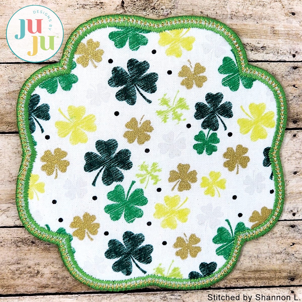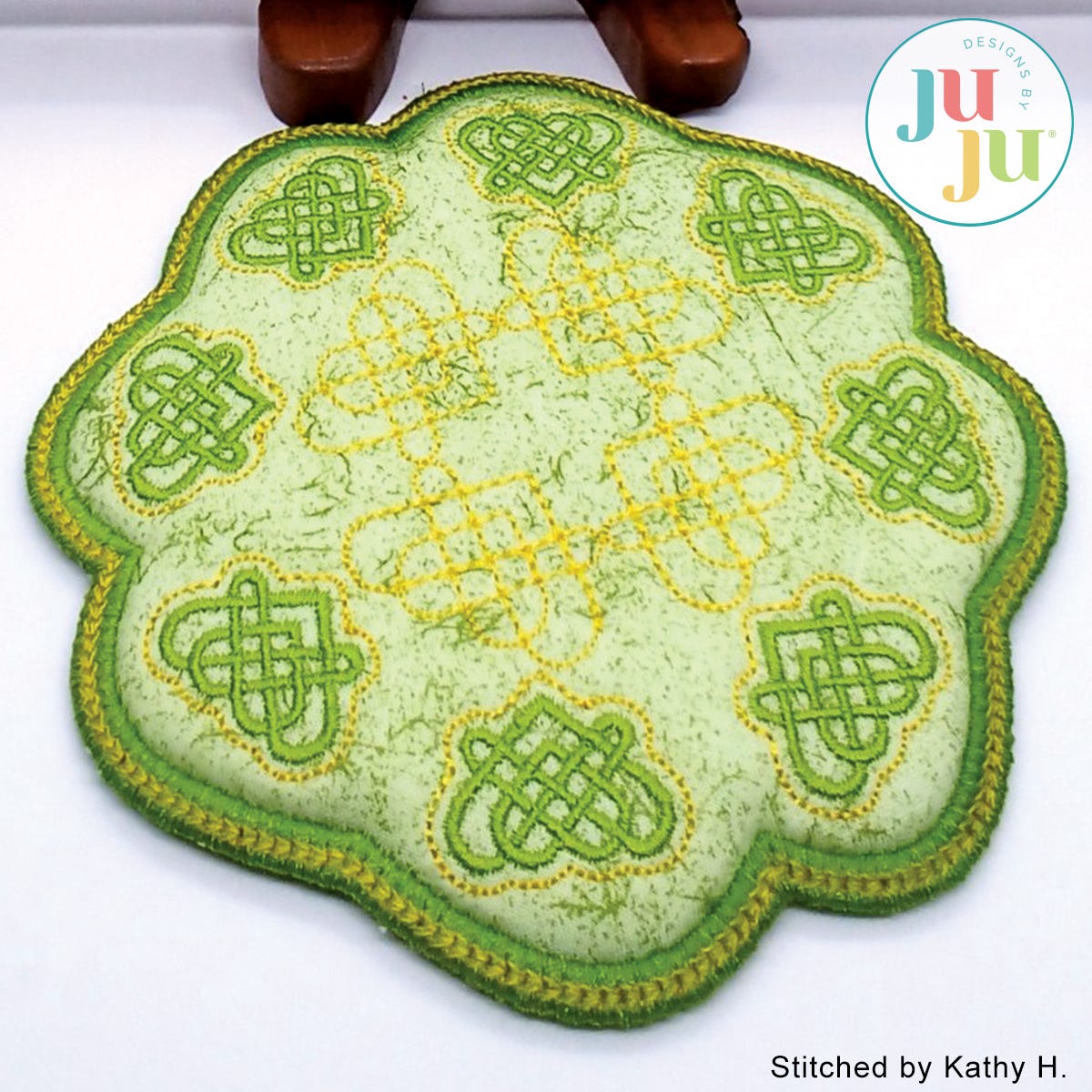 This beautiful candle mat for the 5x7 hoops is stitched in one hooping and requires no additional sewing machine or hand stitching. The theme of the celtic heart is carried through to the quilted center.