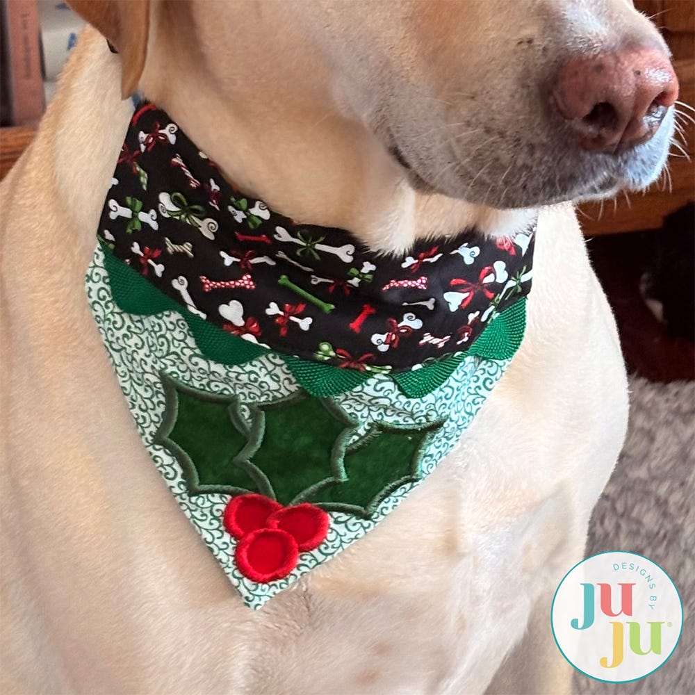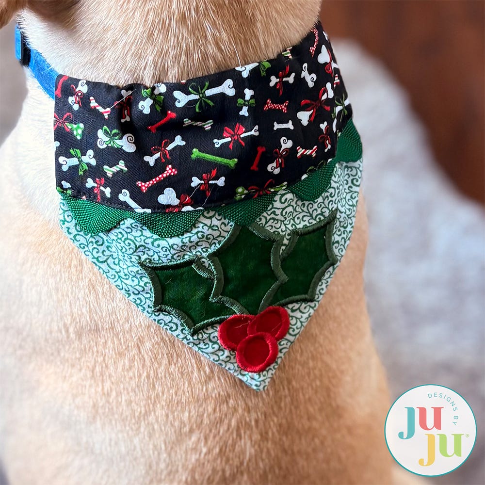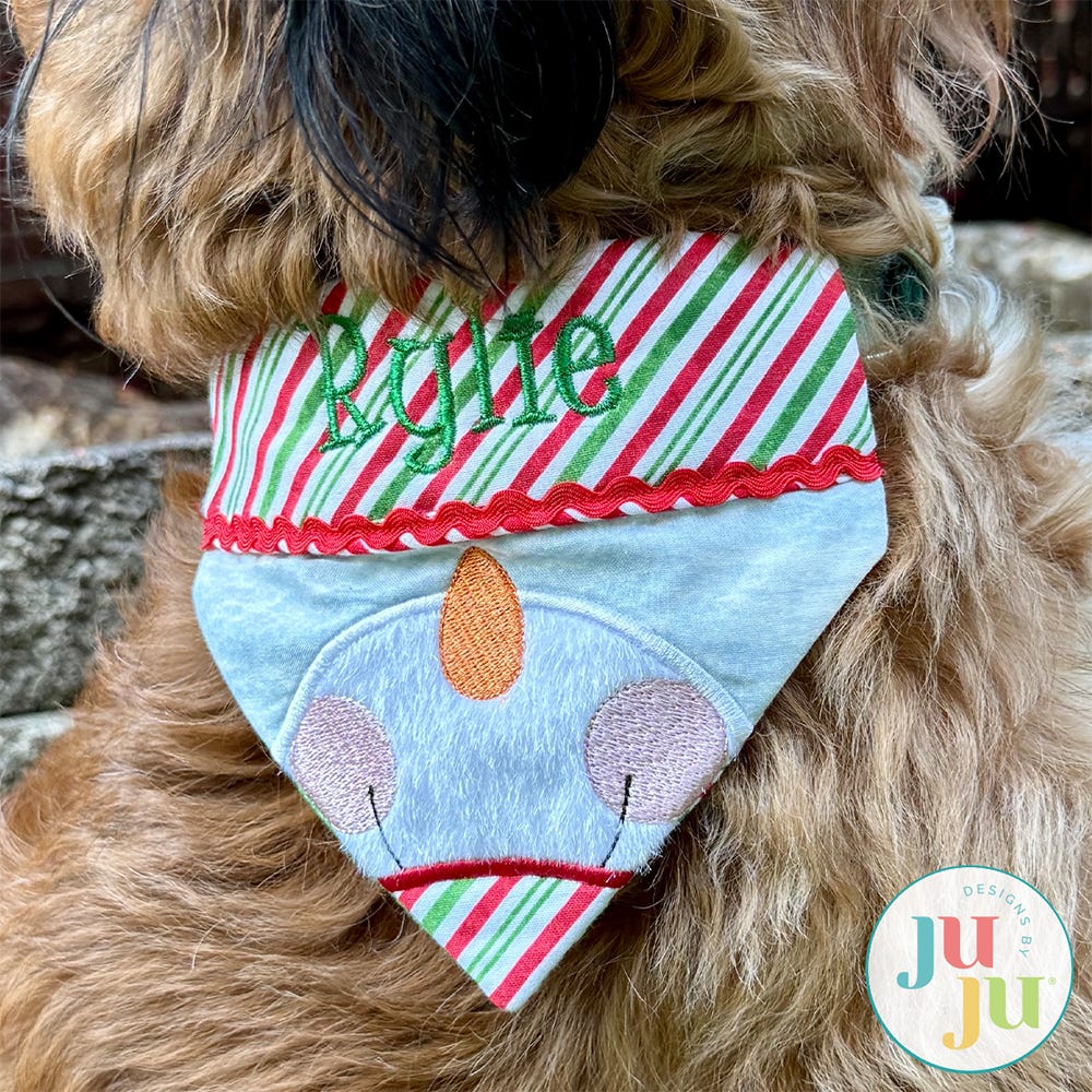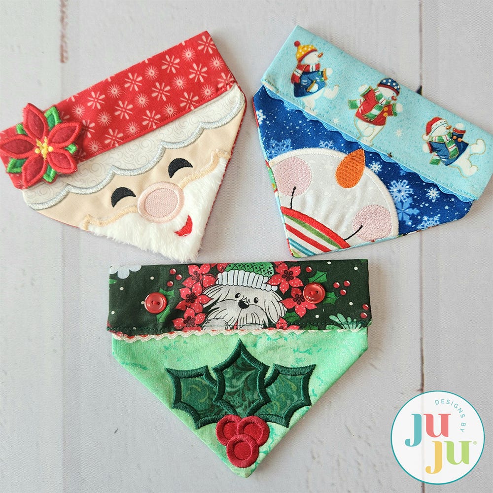 Your puppy can join in the holiday fun with our Christmas Dog Bandanas! This set of three designs each feature a different applique: Santa, Snowman and Holly. The bandana is made in one hooping, then the casing is sewn closed on a regular sewing machine. The Dog Bandana is made to be worn with a dog collar (which is not part of the design).