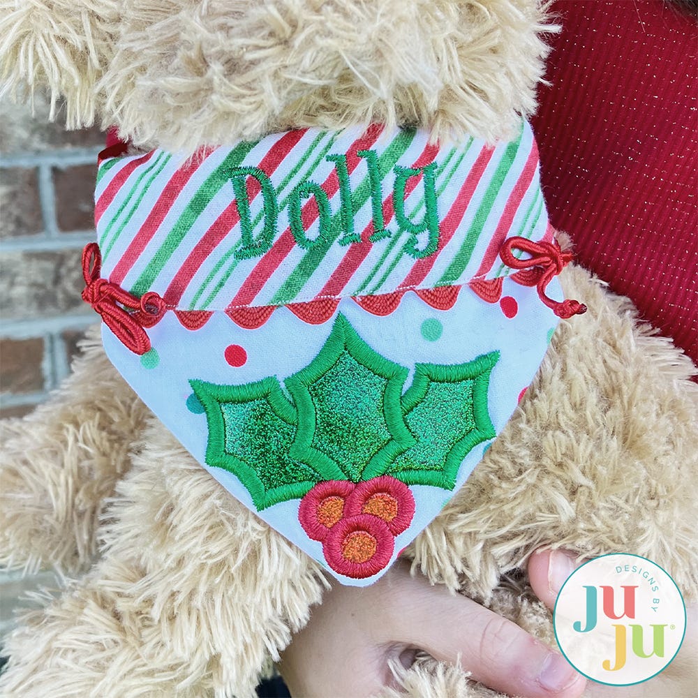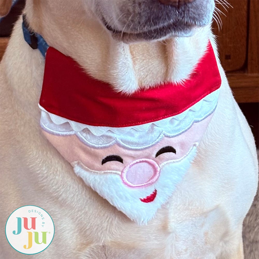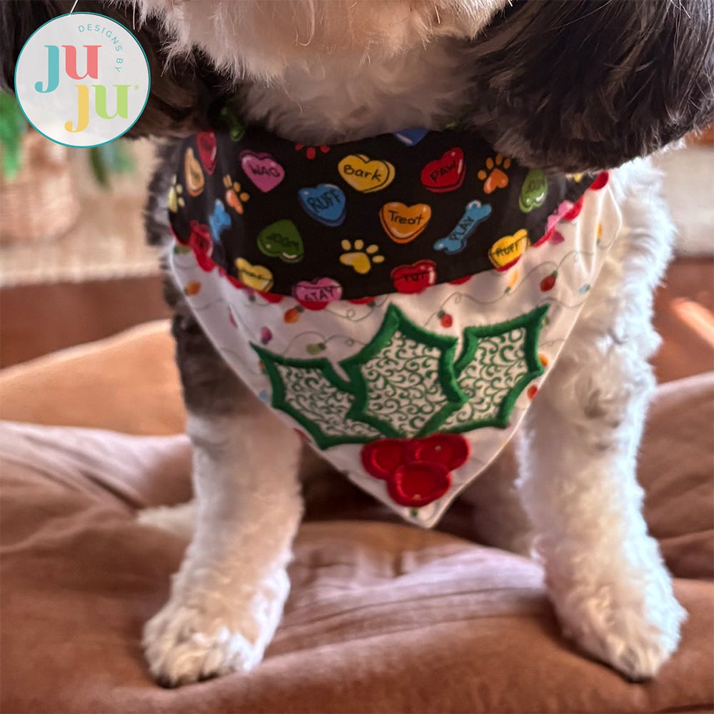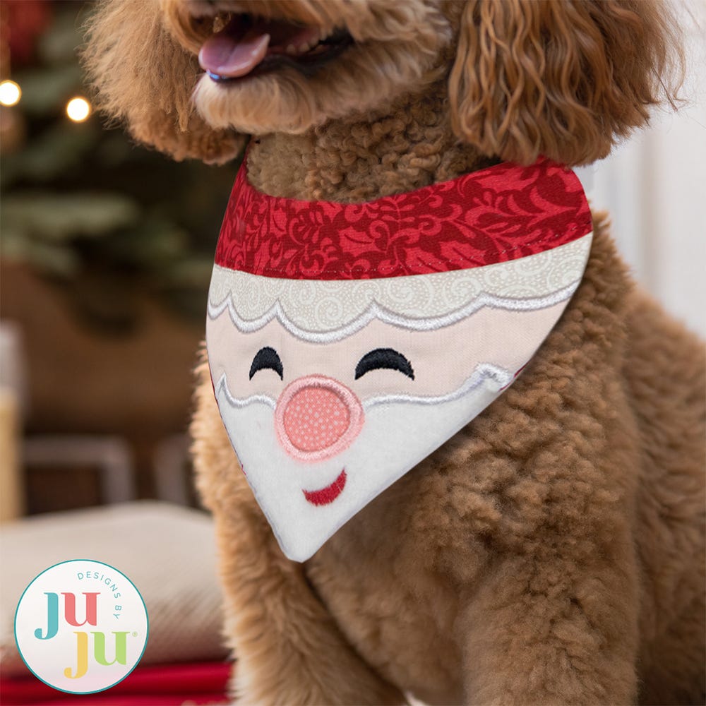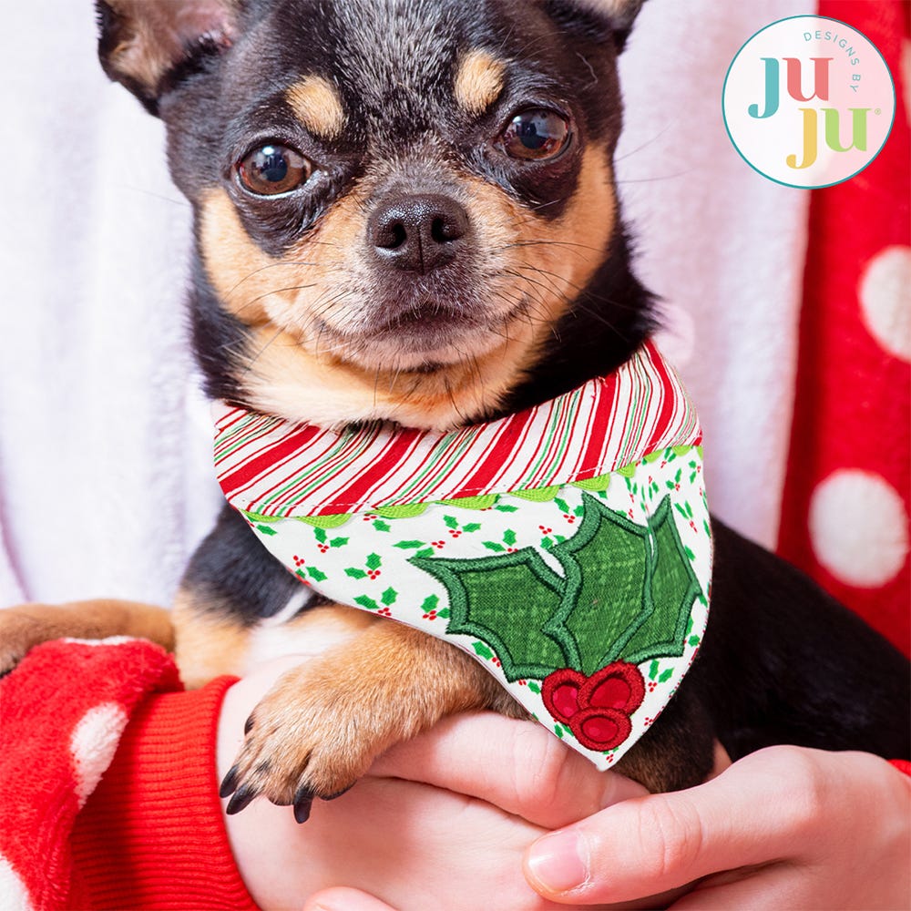 Your puppy can join in the holiday fun with our Christmas Dog Bandanas! This set of three designs each feature a different applique: Santa, Snowman and Holly. The bandana is made in one hooping, then the casing is sewn closed on a regular sewing machine. The Dog Bandana is made to be worn with a dog collar (which is not part of the design).