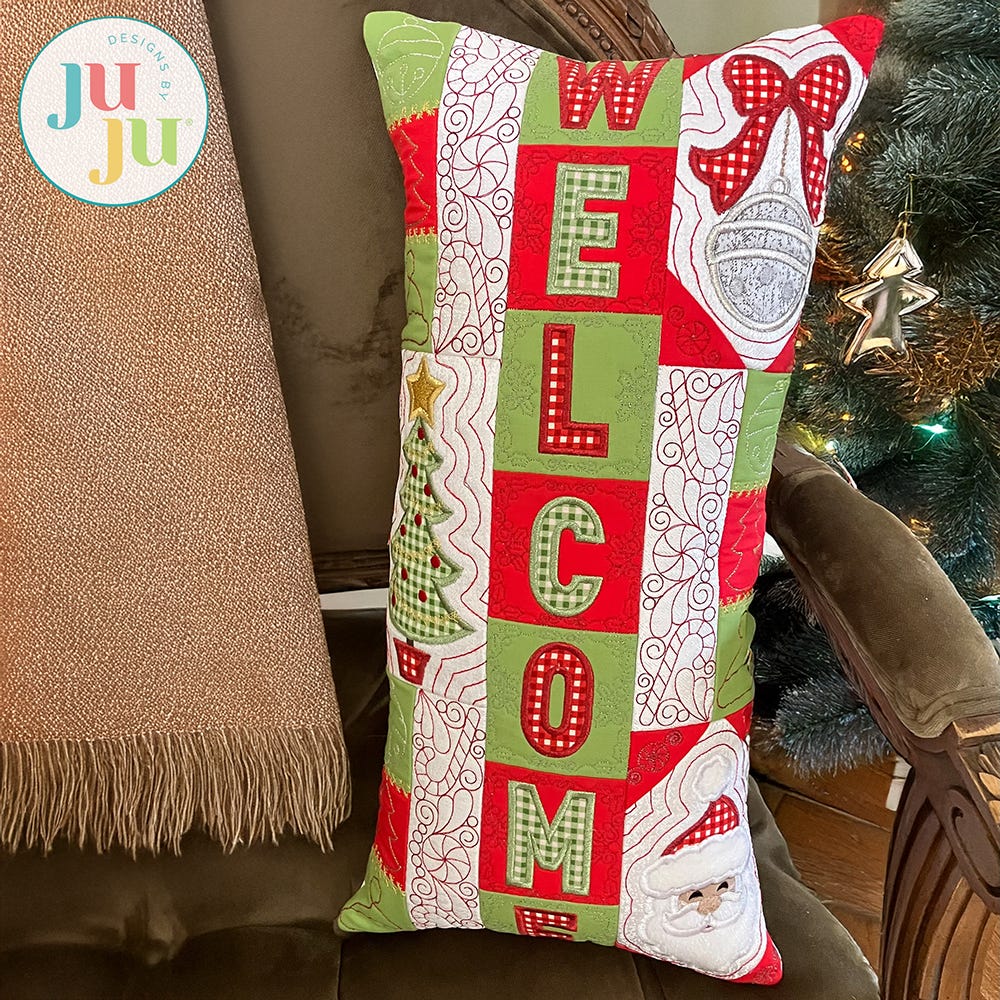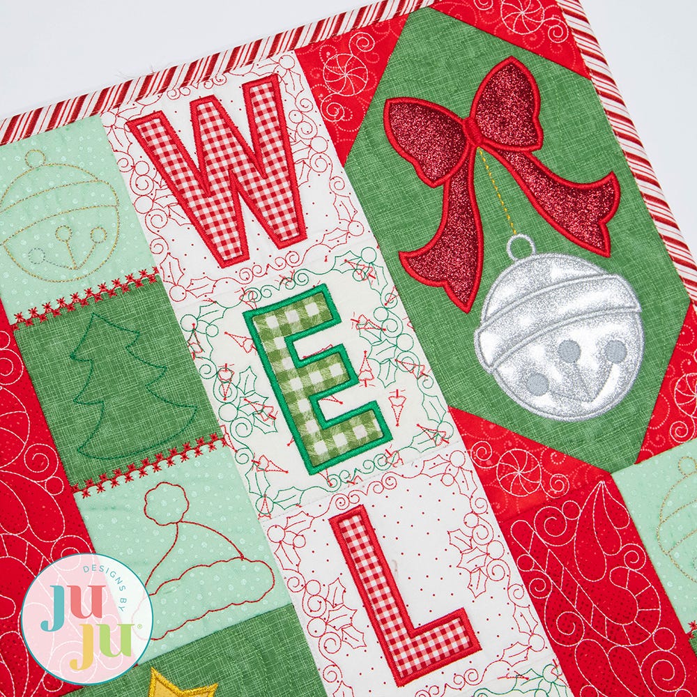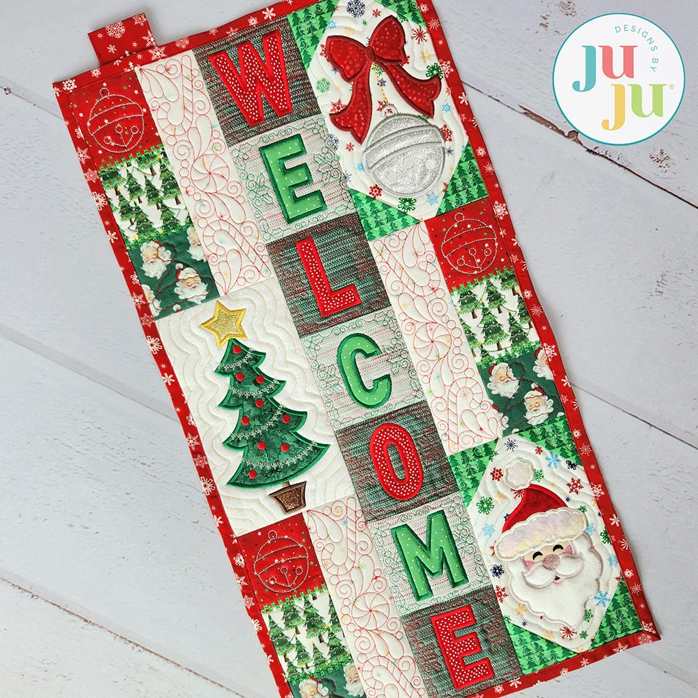 Extend a warm holiday greeting to your guests with our Christmas Welcome Wall Hanging! This project features an applique bell, tree and Santa, as well as patchwork blocks with different quilting motifs. The satin stitch applique lettering is included in the design files, as pictured.