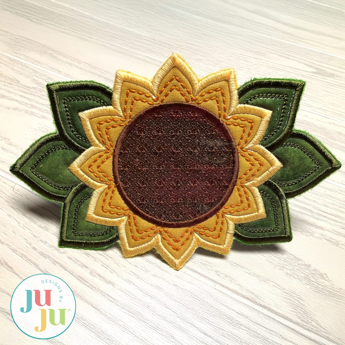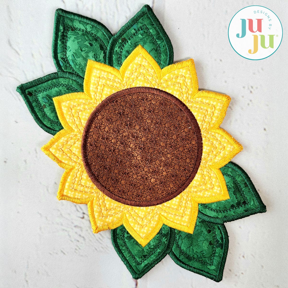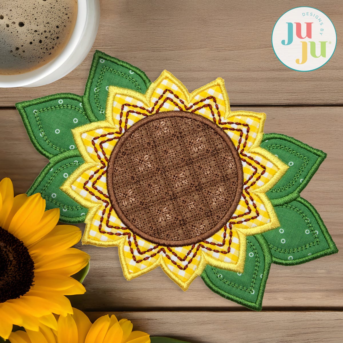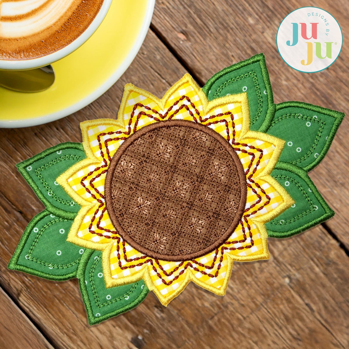 This mug rug features an applique sunflower. It has a satin stitch edge and is stitched on woven water soluble stabilizer. Made in one hooping with no additional sewing required! Complete step-by-step PDF photo tutorial included with your download.