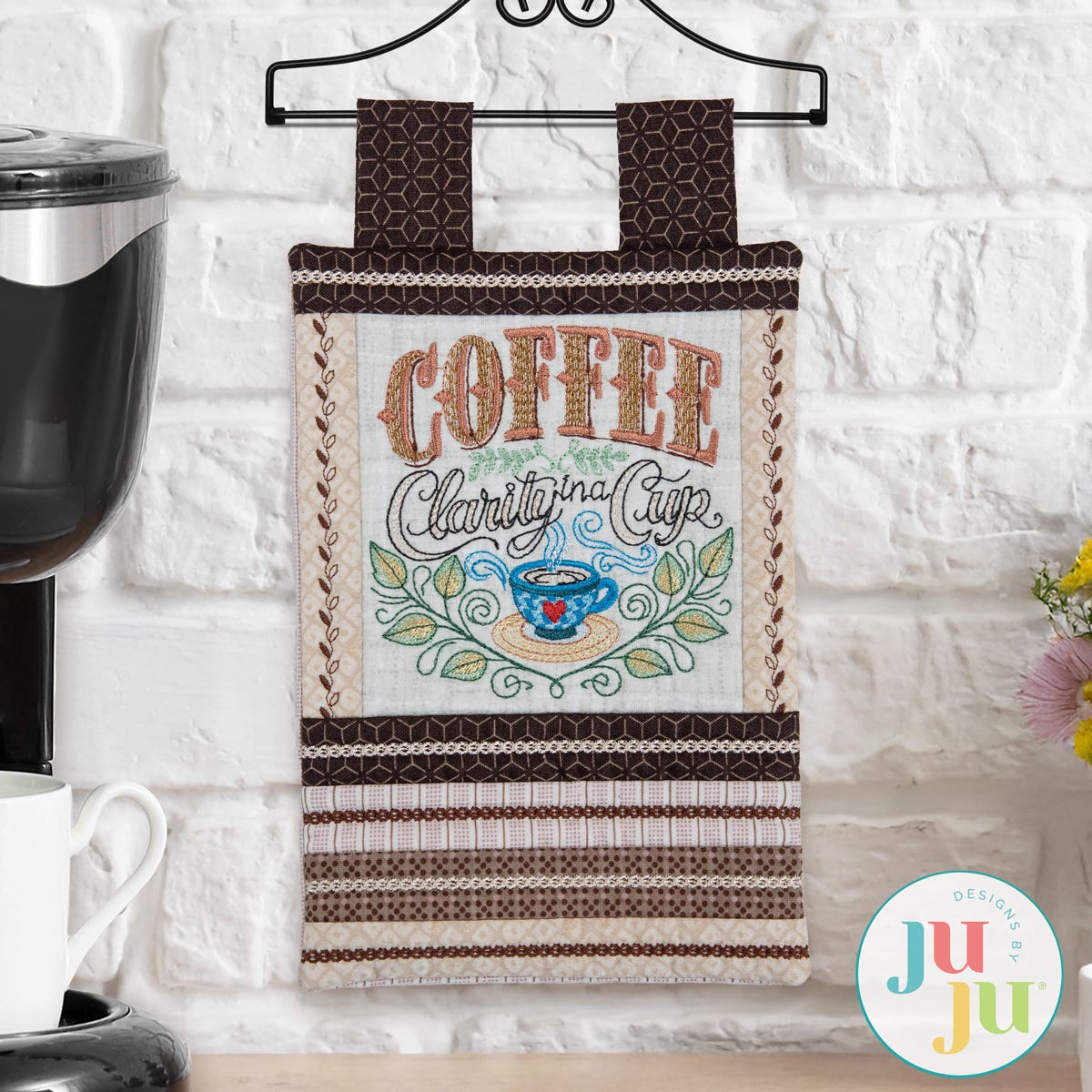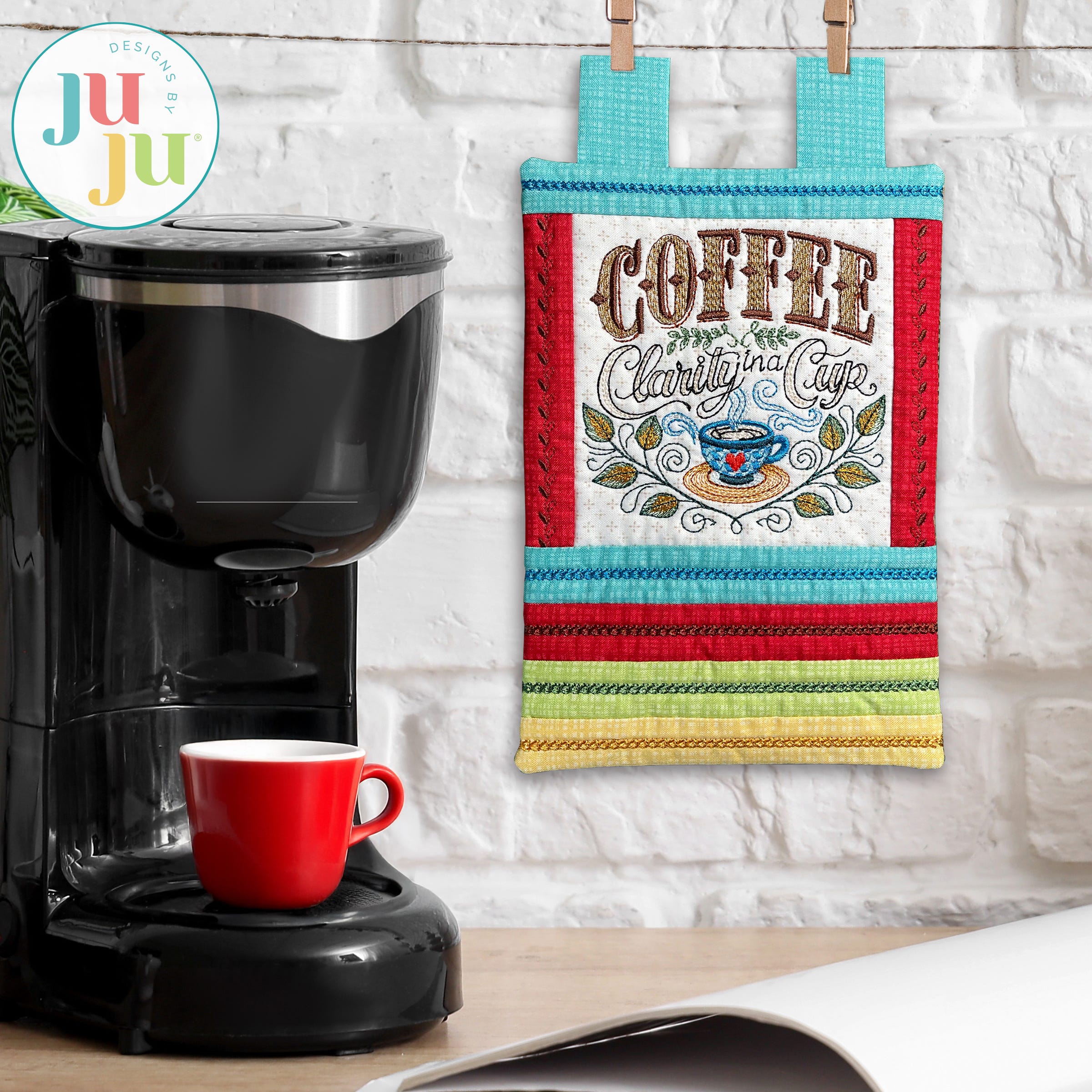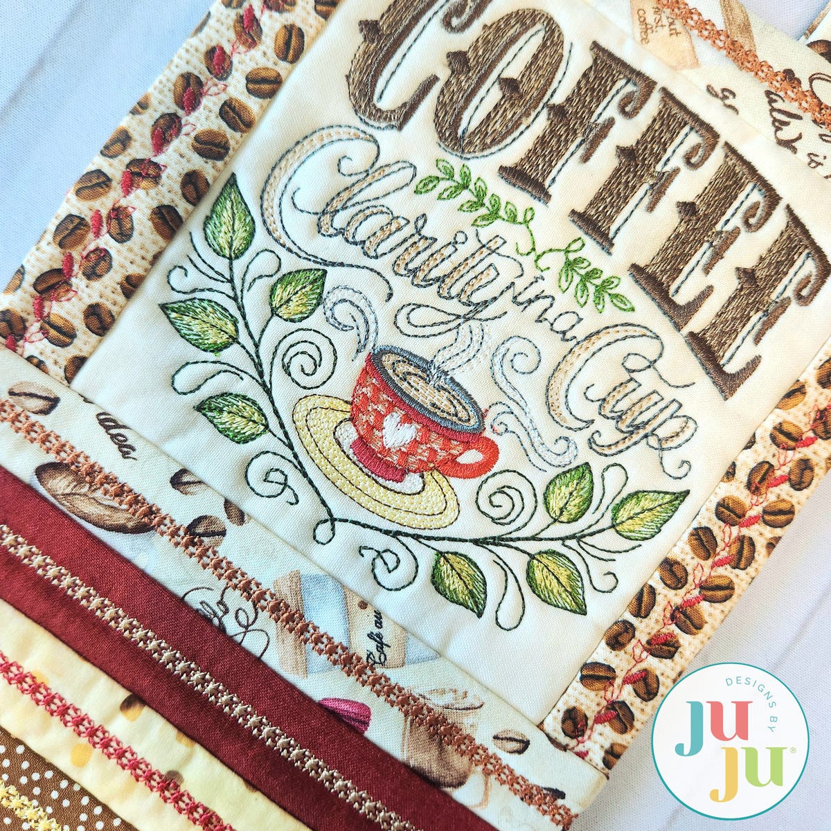 If you love coffee, this in the hoop miniature wall hanging or desk decor is for you! The embroidered text design is framed with stripes of fabric and decorative stitching.