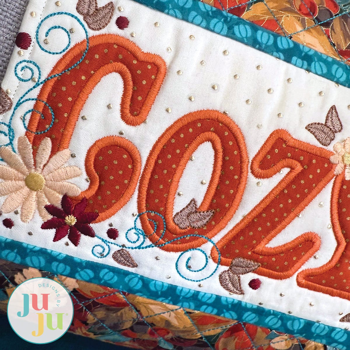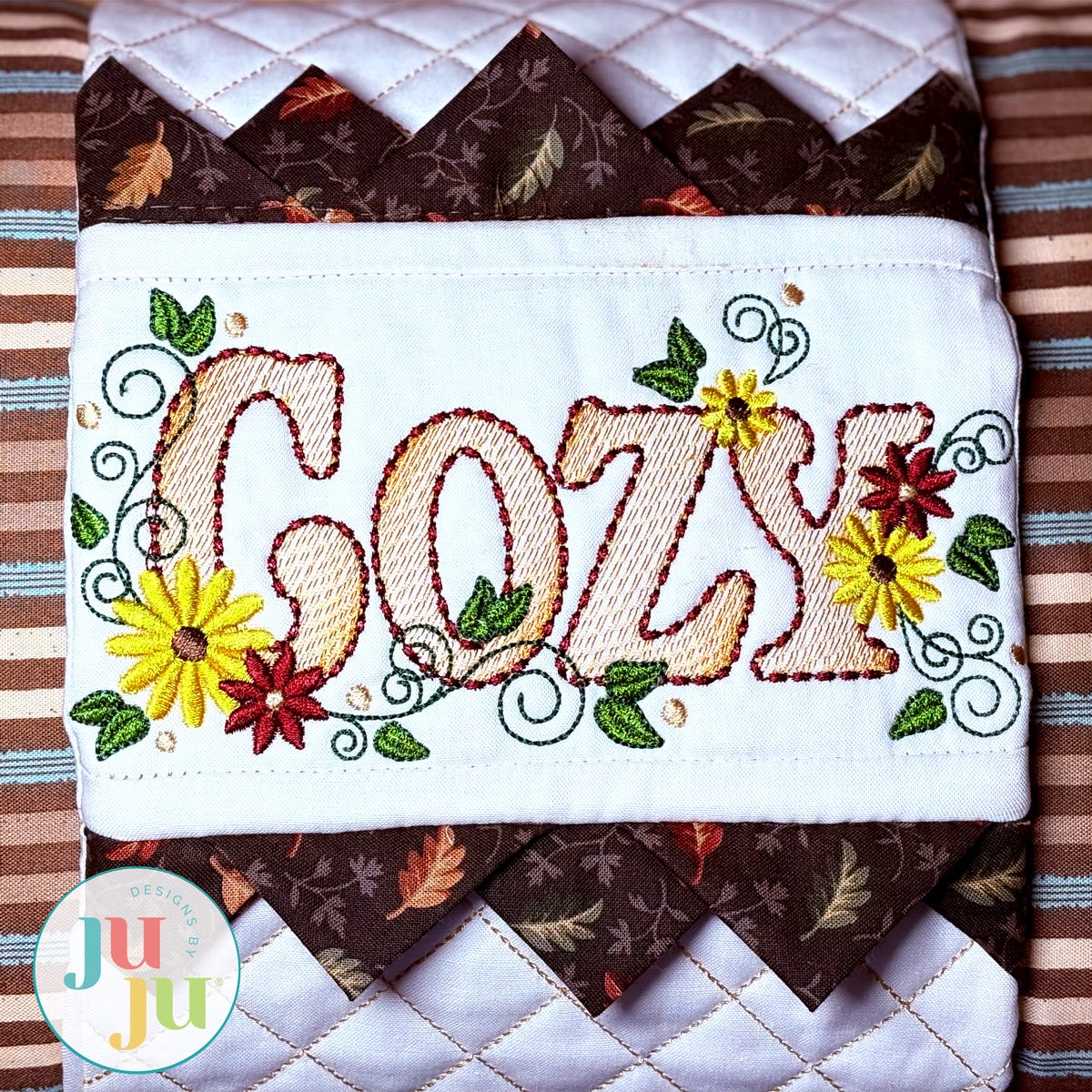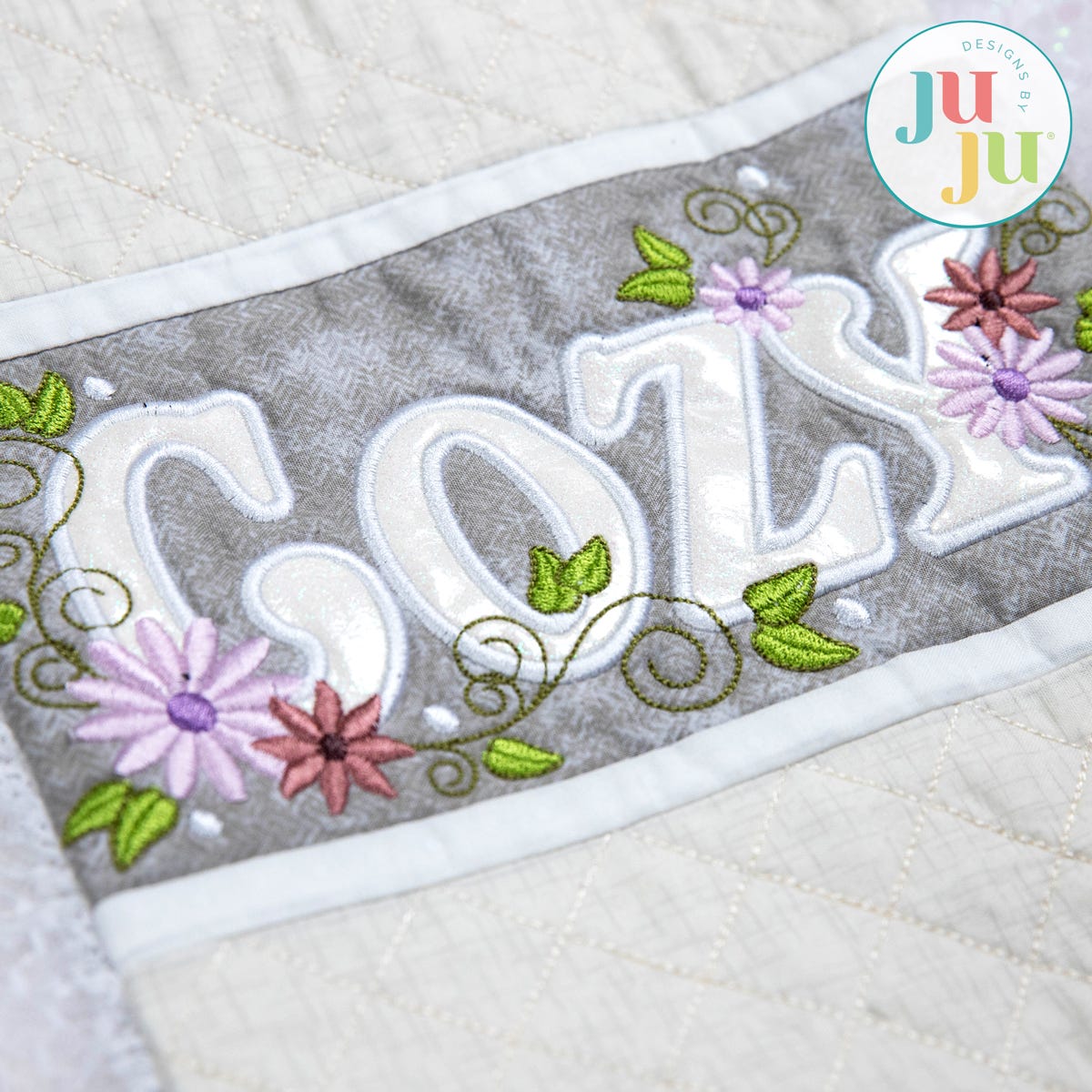 The "Cozy" block is available with two styles of lettering: satin stitch applique or sketch fill. The text is embellished with satin stitch flowers, leaves and berries, and the block is finished with narrow "stitch-n-flip" horizontal borders. The remaining blocks for the wrap simply have crosshatch quilting, allowing your fabric of choice to shine.