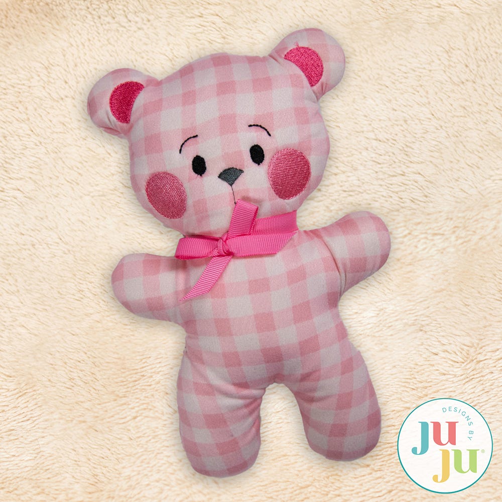 The bear is made in one hooping, the doll is made in two hoopings. We recommend light weight fleece, knits or other stretchy fabrics to make softies, making them easier to turn inside out and stuff. The bear and doll both require a bit of hand sewing to close a small hole once complete.
