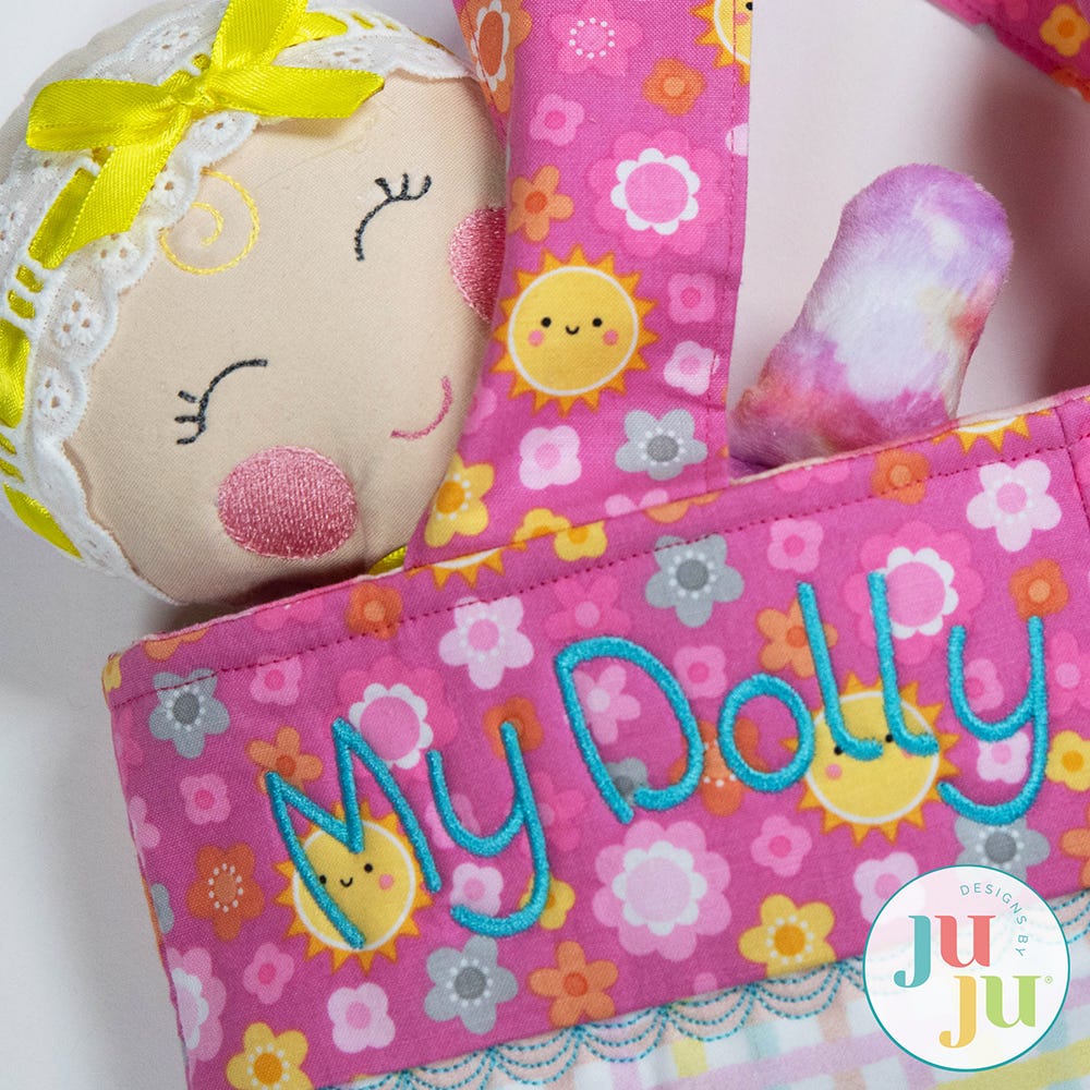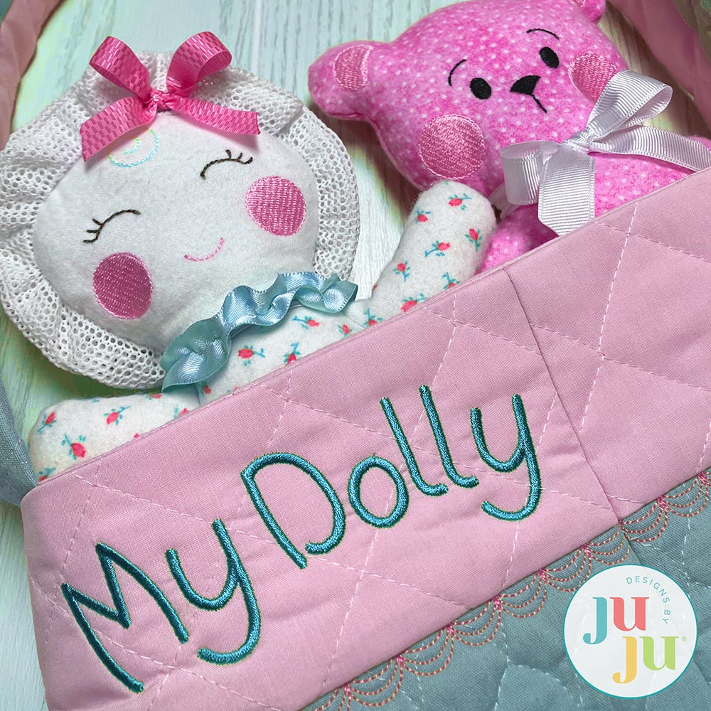 The "My Dolly" text is included in the design file as pictured. The coordinating font Sammy (sold separately); can be used to personalize your bag, as shown in the Landry sample.