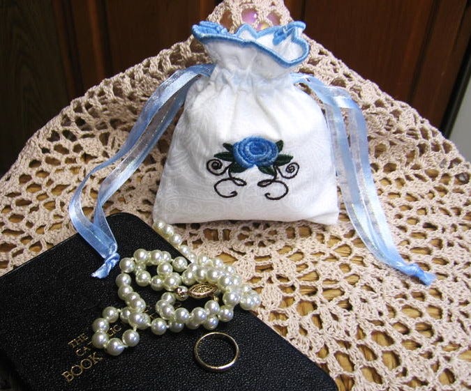 This little drawstring bag is mostly an in-the-hoop project. Only the side seams get sewn on the sewing machine. All seams are finished and the bag is fully lined. A quick and fun project for Valentines, wedding days, or anytime you want to say I love you. Fill the little bag with chocolate kisses, coins, jewelry or use it as a sachet. Stitches up quickly. Wouldn't this also make a great wedding shower favor? Please make sure the design size fits your hoop. Sizes are below.