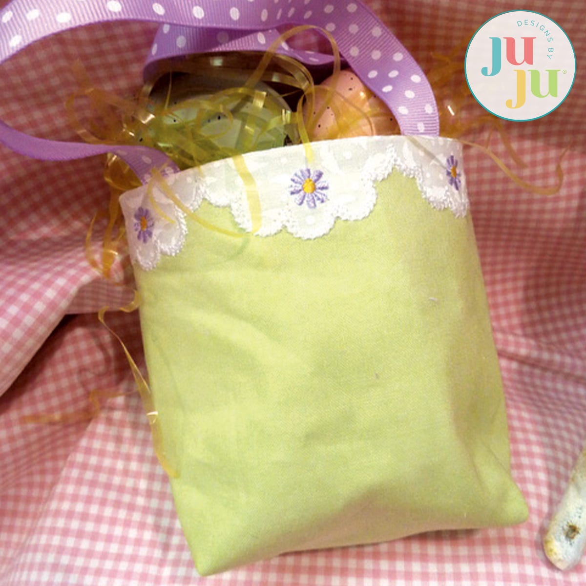 This little gift bag is intended to be used for Easter. However, by leaving off the front center design it becomes a very versatile bag that can be used for many other gift giving occasions as well. Just stitch the back of the bag twice and you have a neutral bag. Most of the bag is stitched as an in the hoop project in two simple hoopings; only the side and bottom seams need to be sewn on the sewing machine. The bags are fully lined and no raw seams are visible. The decorative edge and the egg are appliqued. The handles can be made from fabric (instructions included) or grosgrain ribbon.