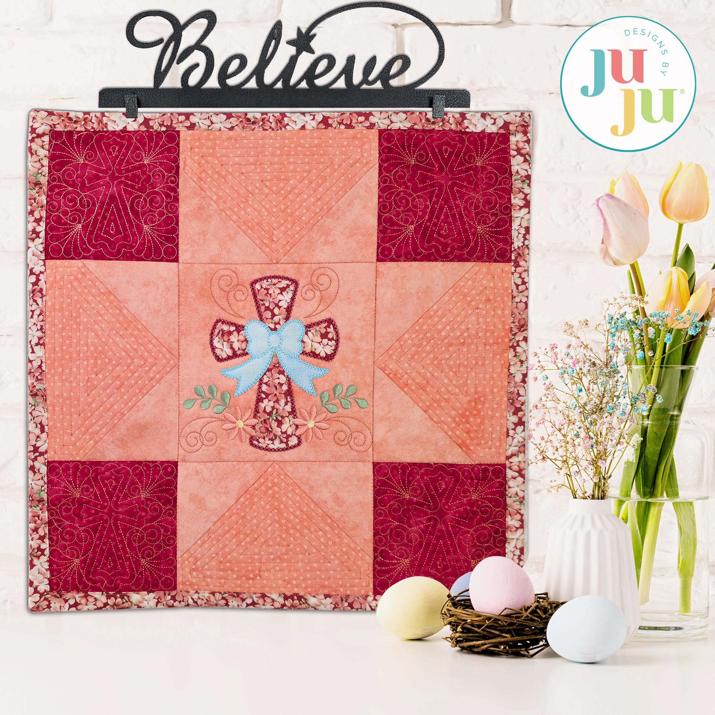 Decorate for Easter with our new mini quilt! This project is similar to a large sawtooth star quilt block. The center features an applique cross with a bow and flowers. It's the perfect size for a little table decoration. Add tabs for a wall hanging, or make it a pillow!