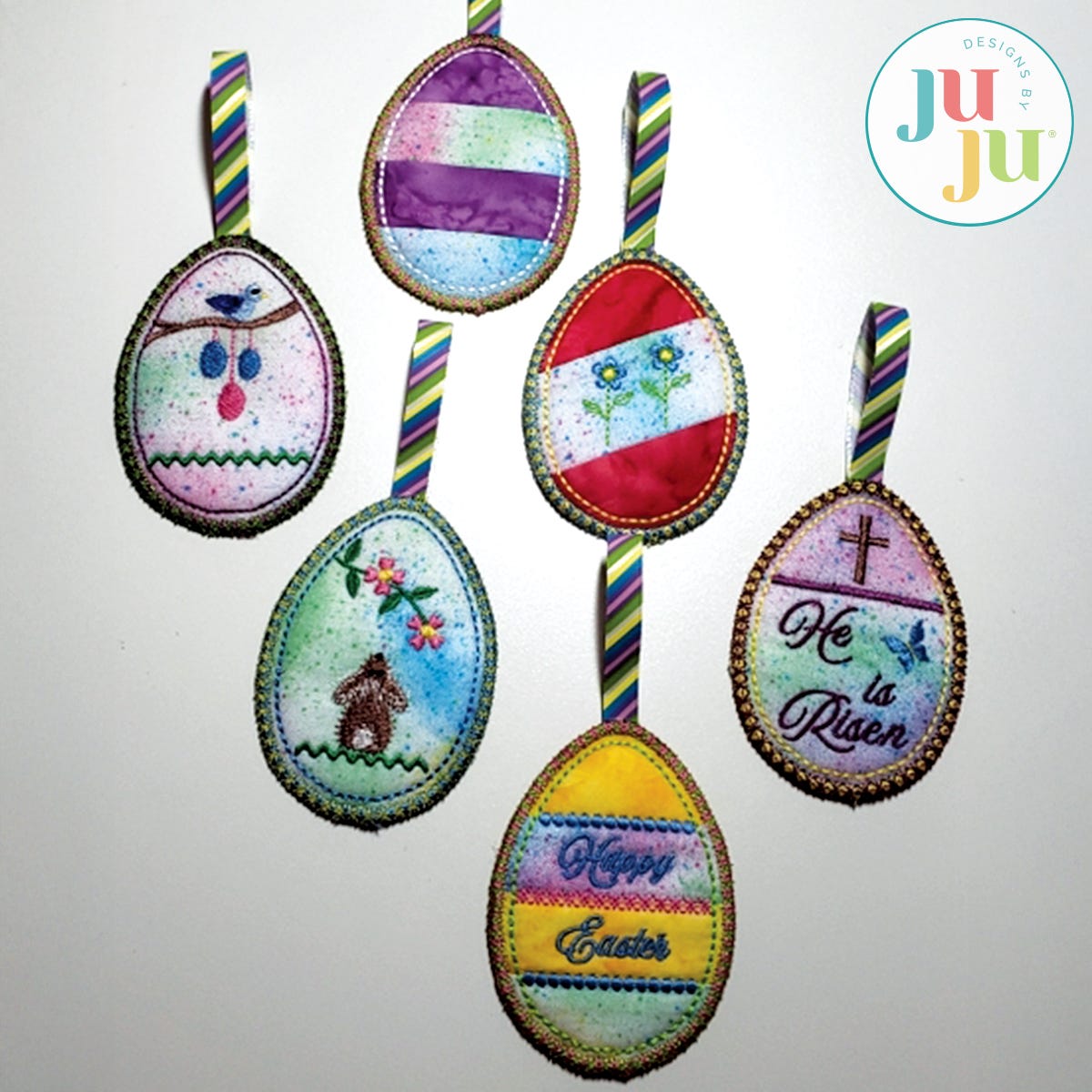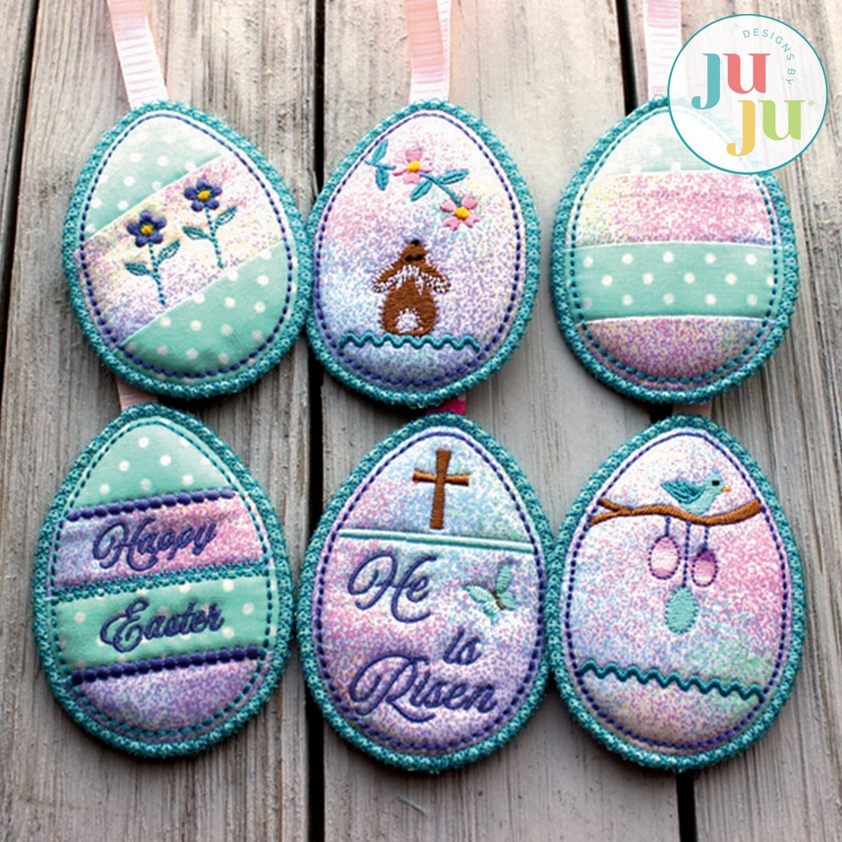 These 6 slightly puffed egg shaped ornaments are fast to stitch and would be perfect for home decorating for Spring and/or attaching to Easter baskets. They make great small gift ideas for coworkers and teachers, too. Personalize them by placing a name on the plain egg ornament. A good project for using up your stash of spring fabric scraps.
