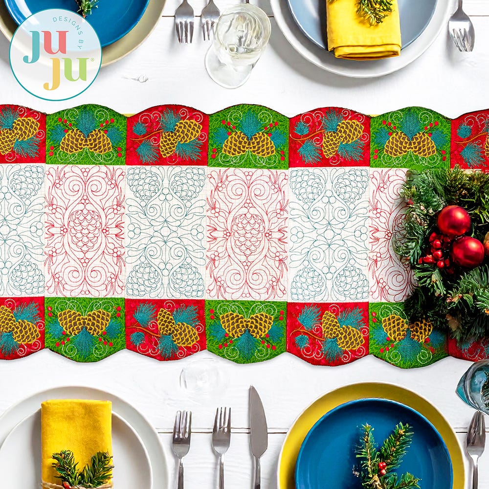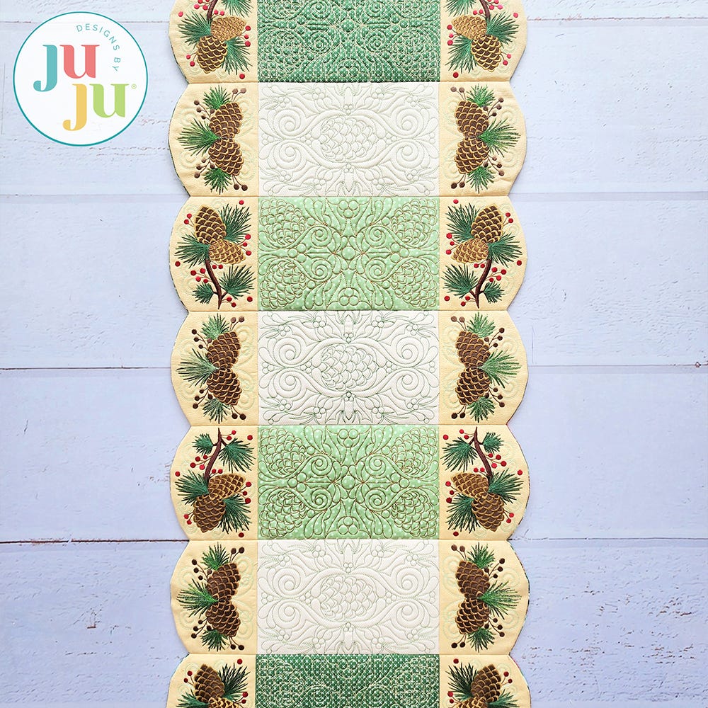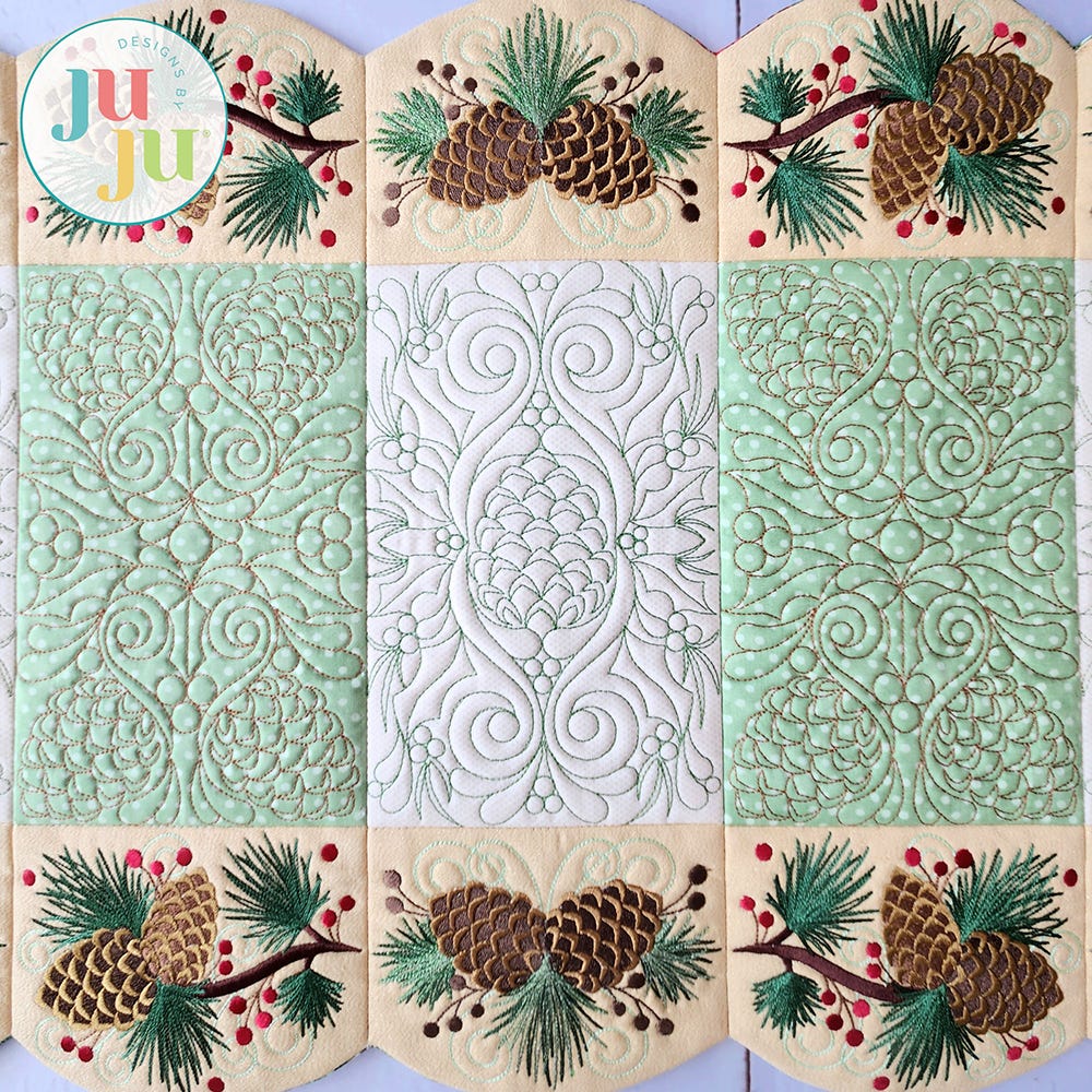 Our Elegant Pinecone Table Runner will be a stunning centerpiece for your winter gatherings. The center blocks feature intricate quilting designs, while the border blocks have exquisite embroidery-only designs of pinecones, branches and berries.