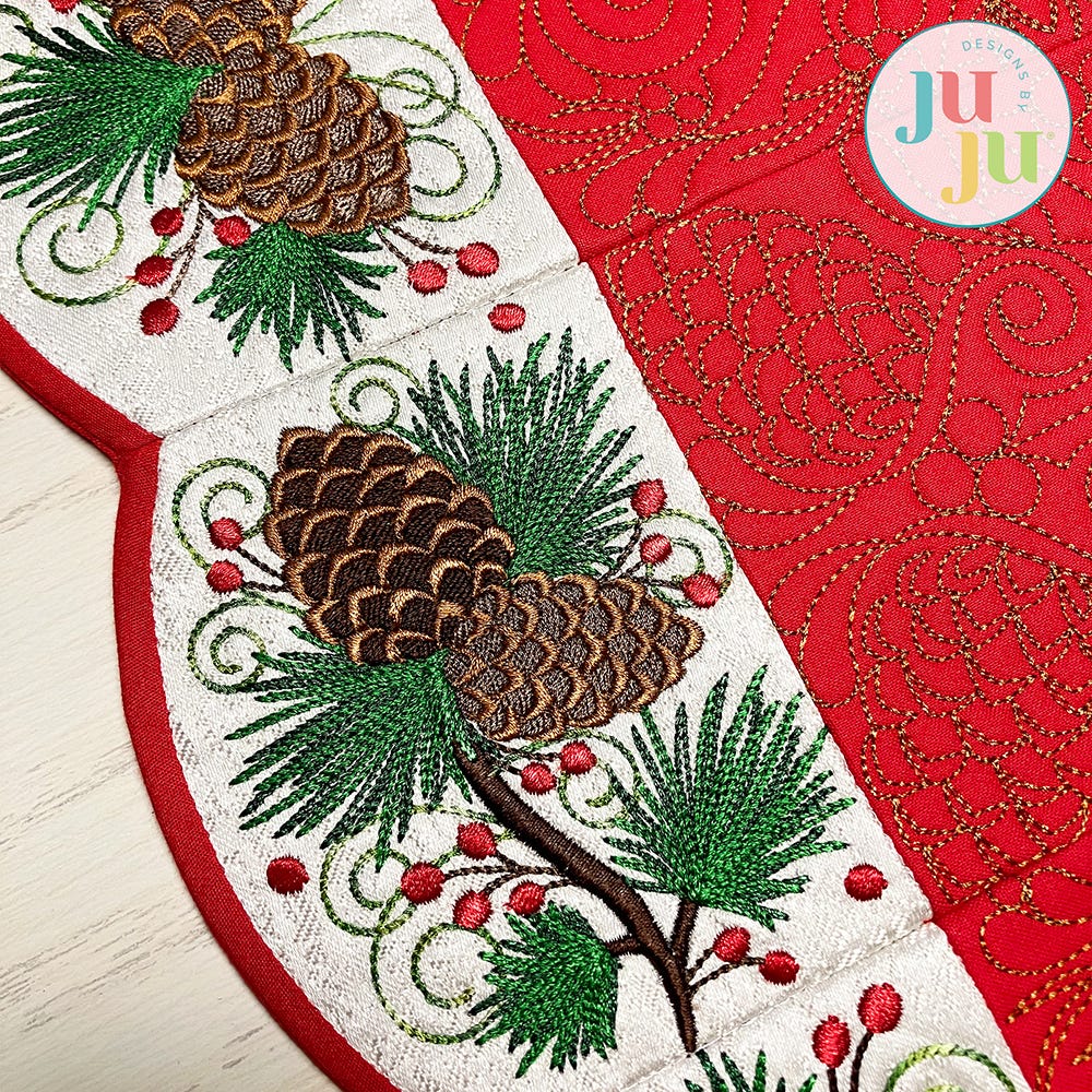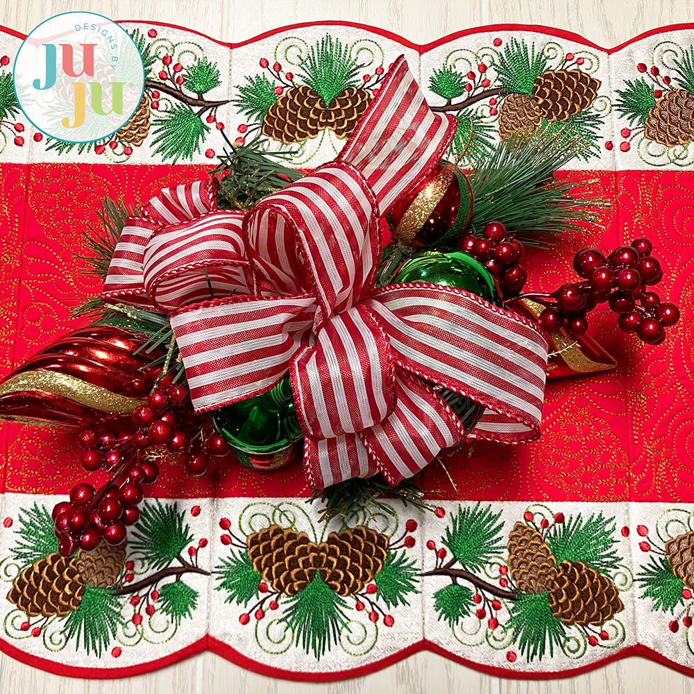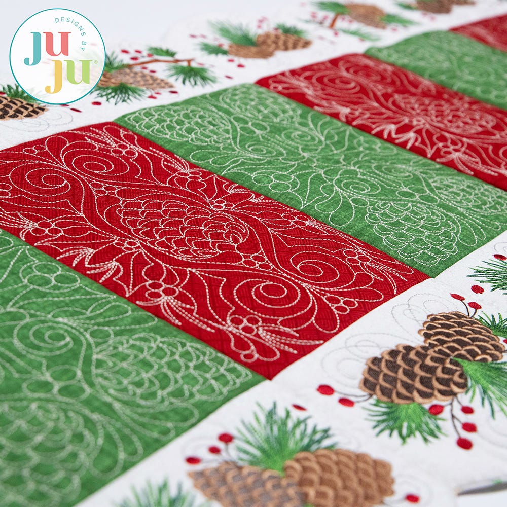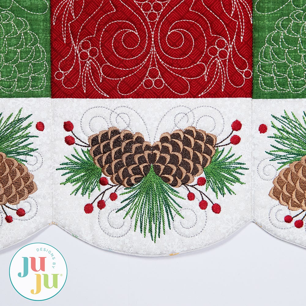 Our Elegant Pinecone Table Runner will be a stunning centerpiece for your winter gatherings. The center blocks feature intricate quilting designs, while the border blocks have exquisite embroidery-only designs of pinecones, branches and berries.