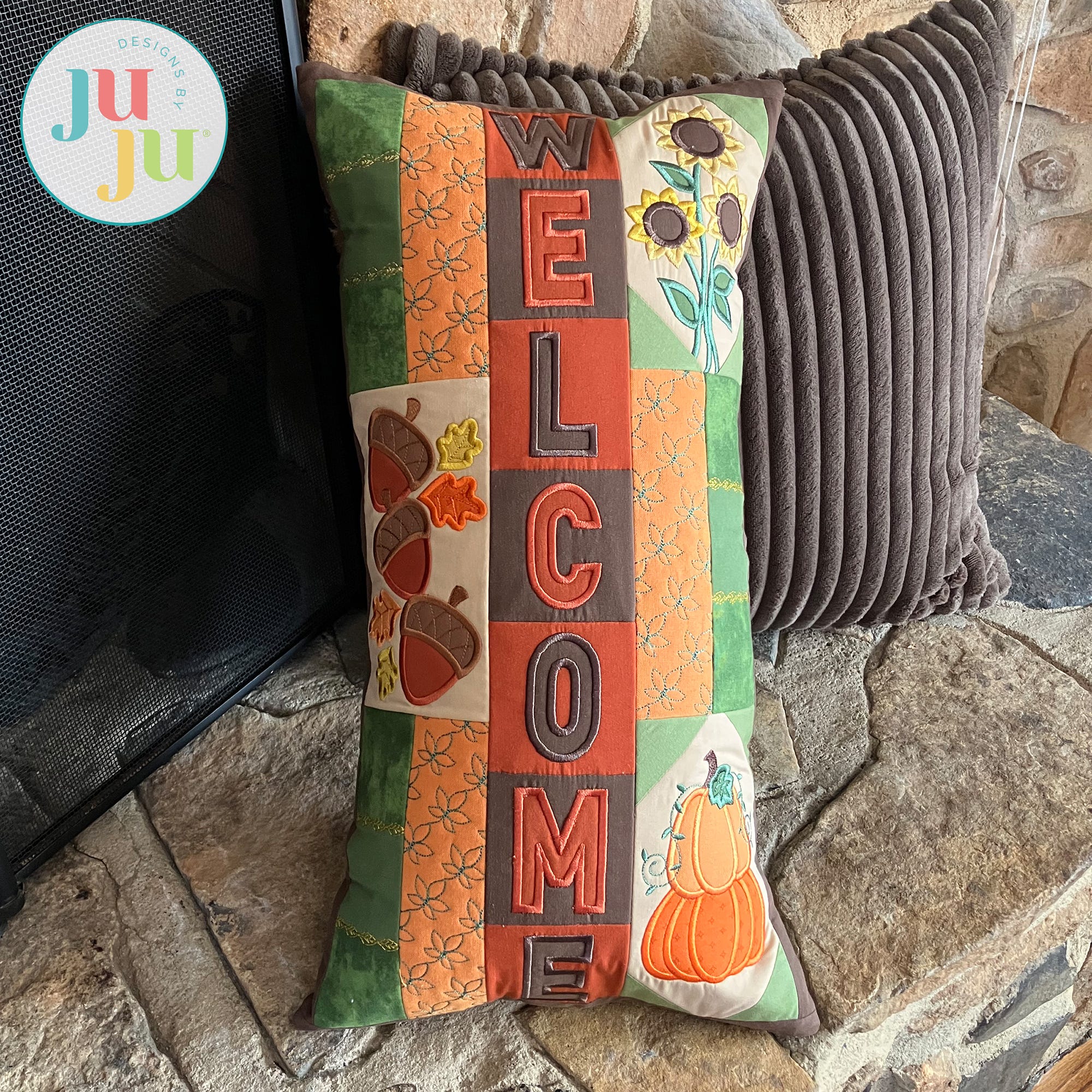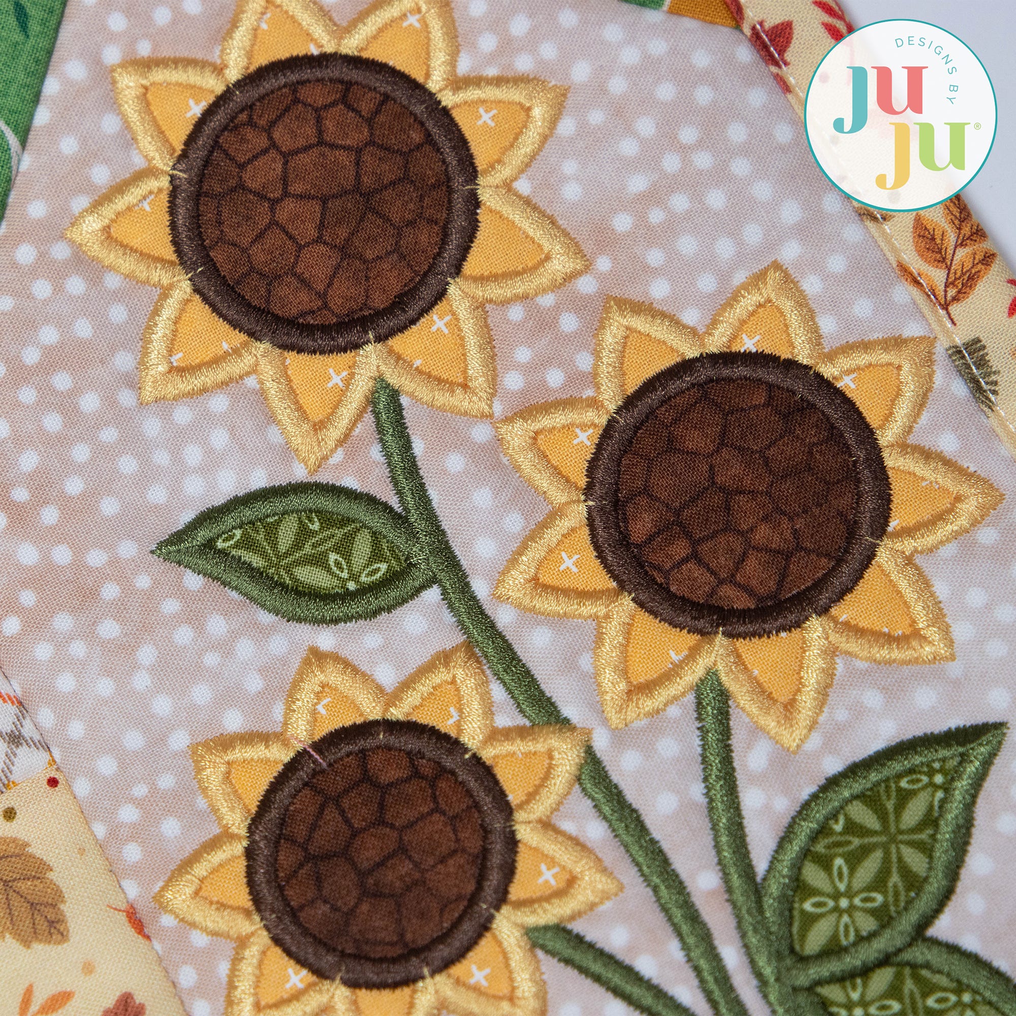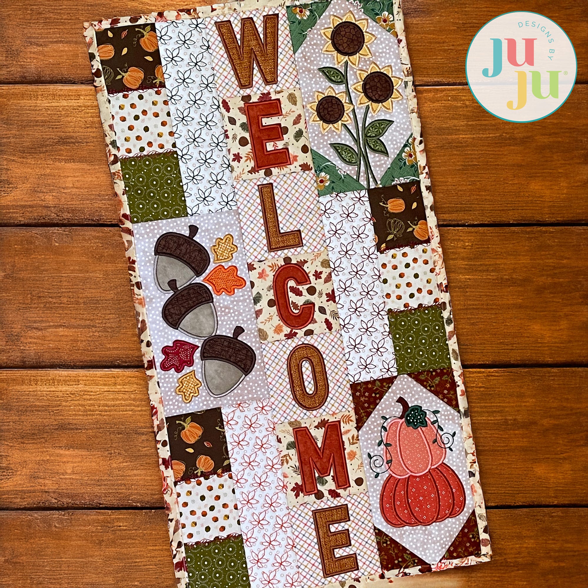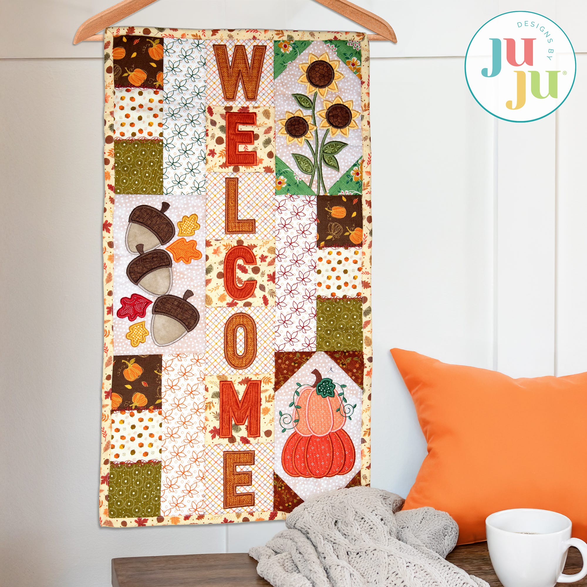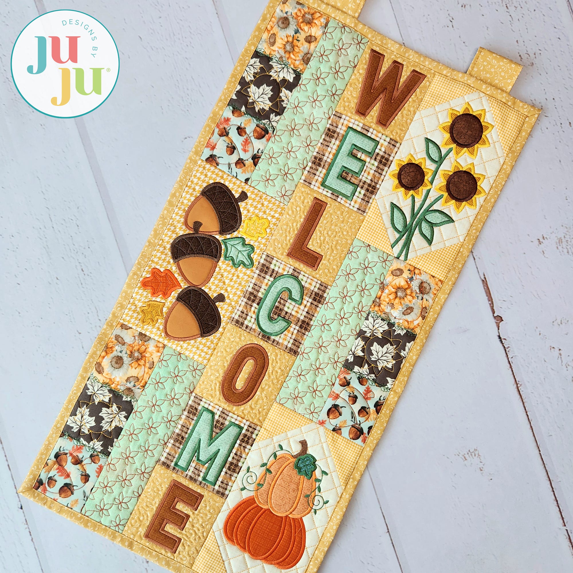 Extend a warm autumn greeting to your guests with our Fall Welcome Wall Hanging! This project features applique sunflowers, pumpkins and acorns, as well as patchwork blocks with different quilting motifs. The satin stitch applique lettering is included in the design files, as pictured.
