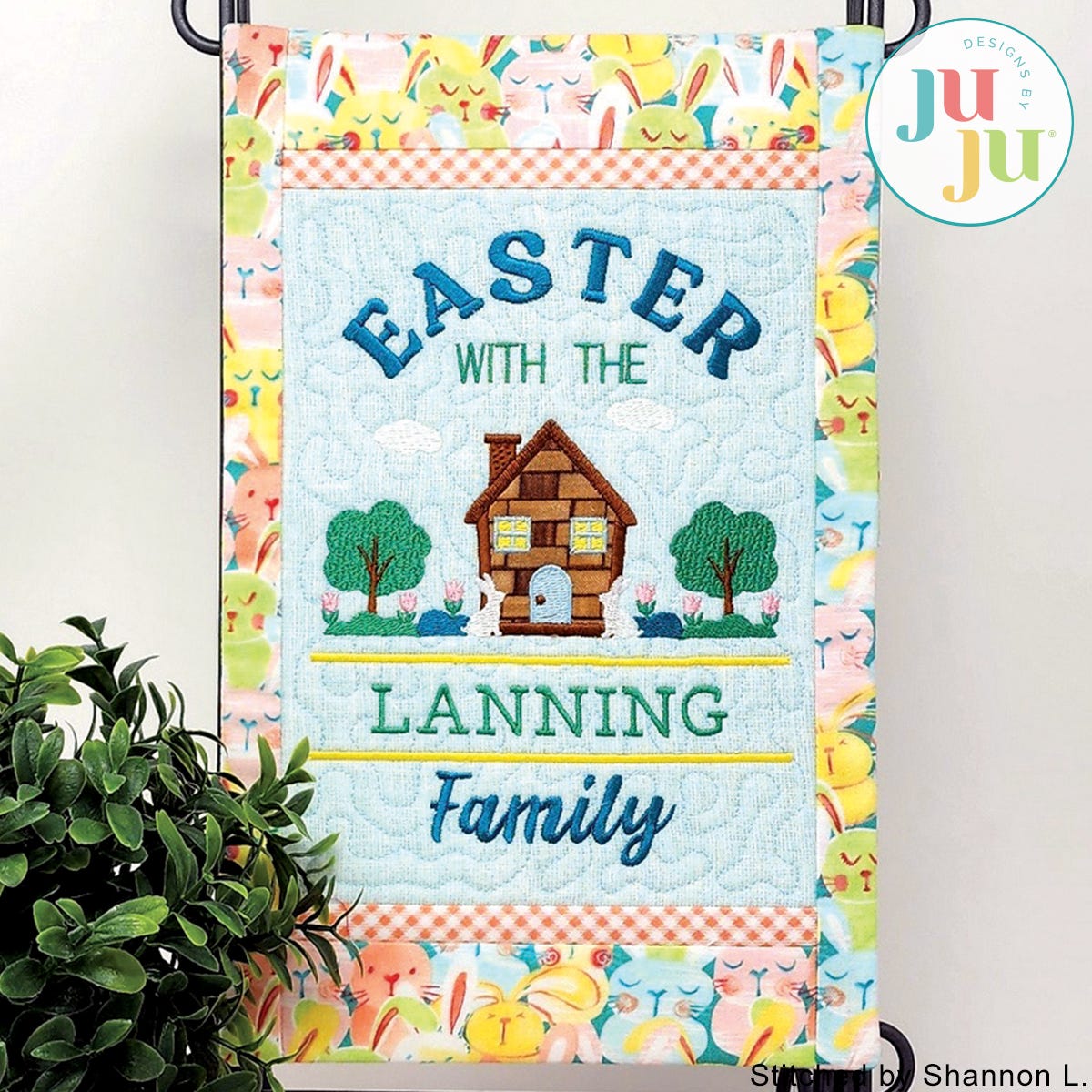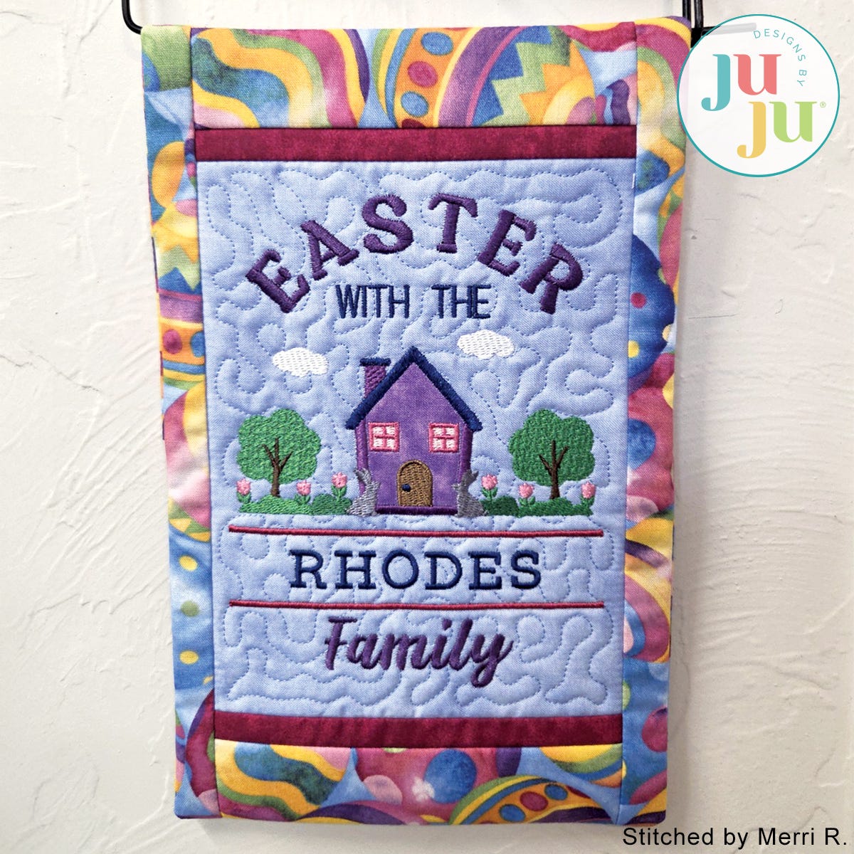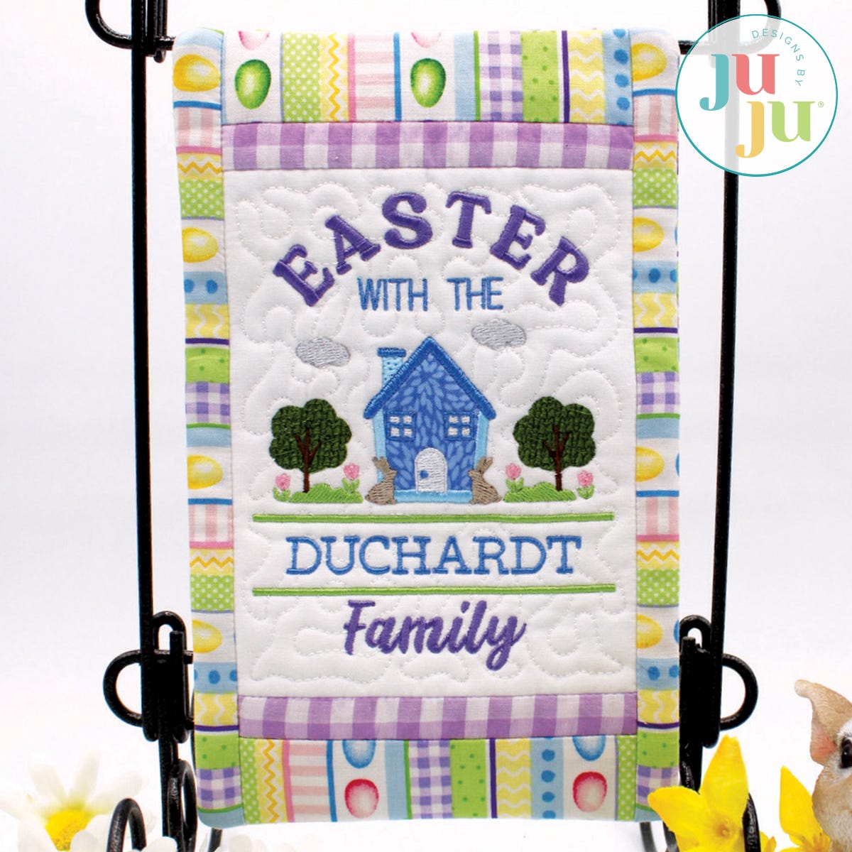 This Easter mini quilt is entirely made in the hoop. No additional hand or sewing machine stitching required. The background of the mini quilt is stipple quilted in the hoop and the various borders get attached while in the hoop. The house is appliqued.