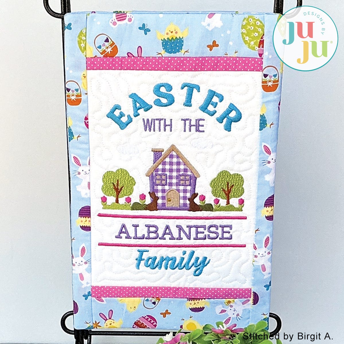 The family name insertion requires a 1/2" font. There is a "sleeve" in the back of the mini quilt that will make it easy to hang the quilt. The sleeve, too, is applied during the embroidery process. The design comes with thorough instructions in pdf format with many photos. Also available for sale in a Christmas version.