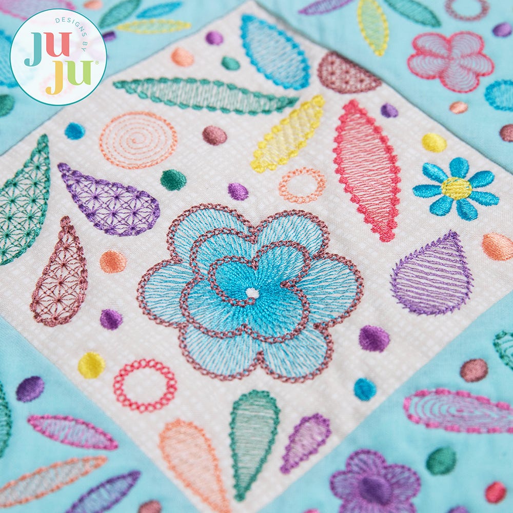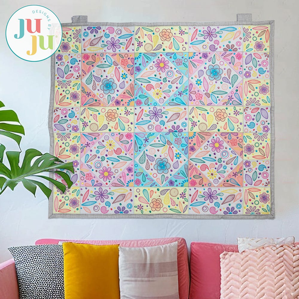 Immerse yourself in a world of artistry and blooms with this stunning project, featuring intricate floral shapes woven into an abstract design. Each embroidery-only block is a work of art on its own with a blend of sketch, motif and satin stitch elements. Designed to be rearranged or used individually, they offer endless creative possibilities for smaller projects like table runners, pillows, or mini quilts. Whether displayed as a statement piece or reimagined in unique ways, this quilt project brings elegance, versatility, and handcrafted beauty to any space.