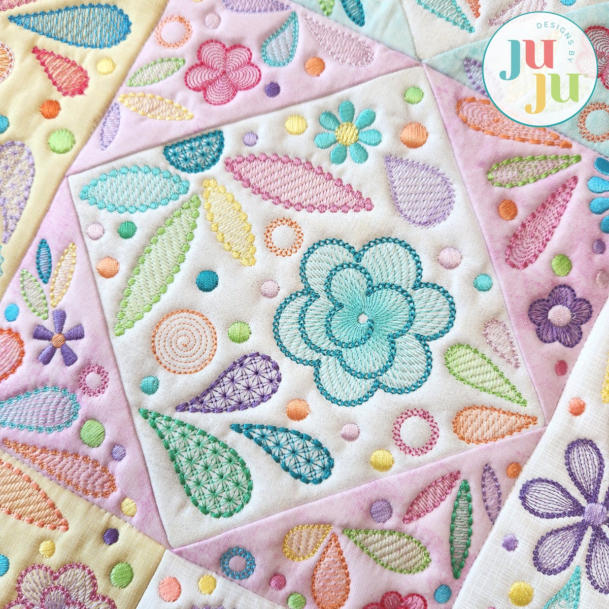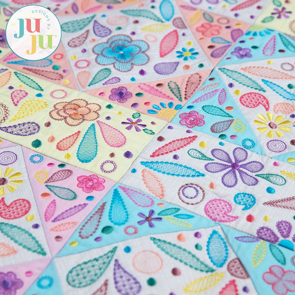 For the regular design files, each of the six main blocks is made in multiple hoopings: the diamond in the middle and the four triangles are made in a separate hoopings, then the triangles need to be sewn to the square to form the overall block.
